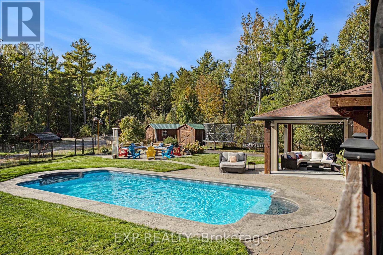 Step Into A World Where Luxury, Privacy, And Nature Unite In Perfect Harmony! Tucked Away In A Prestigious Golf Course Community, This Exceptional Estate Rests On Nearly Six Acres Of Rolling Greenery And Towering Trees, Creating A Setting Unlike Any Other. As You Arrive, The Tranquility Of The Property Is Instantly Apparent. Step Through The Front Door Into A Spacious Foyer That Opens To Sun-Filled Living Areas Adorned With Hardwood Floors And Expansive Windows Framing Picturesque Views. The Inviting Living Room Centers Around A Striking Wood-Burning Fireplace, Adding Warmth And Character To Every Gathering. The Heart Of The Home Is A Chef-Inspired Kitchen Designed For Beauty And Function, With Solid Wood Cabinetry, Granite Counters, And Premium Stainless Steel Appliances, Including Double Ovens And An Oversized Fridge. A Generous Island And Adjacent Dining Area Make Entertaining Effortless, Flowing Seamlessly Toward The Backyard Paradise. Upstairs, The Primary Suite Offers A Peaceful Escape With A Juliette Balcony And Spa-Inspired Ensuite. Each Additional Bedroom Features Its Own Ensuite, Ensuring Comfort And Privacy For Family And Guests. The Fully Finished Basement Extends The Living Space With Areas For Recreation, Fitness, Or Movie Nights. Step Outside And Discover The True Highlight Of This Estate-A Resort-Style Backyard. A Saltwater Pool Is Surrounded By Lush Landscaping, Expansive Interlock, And A Timber-Framed Pool House With Wet Bar, Sitting Area, Outdoor Shower & Change Room. Gather Around The Built-In Fire Pit Beneath The Stars, Explore Private Trails, Or Simply Relax In Your Outdoor Sanctuary. With A New Furnace, Irrigation System, Heated Garage W/Epoxy Flooring, Secondary Laneway, And Two Wells-The Second Dedicated To Front And Back Irrigation-Every Detail Has Been Thoughtfully Designed. This Property Perfectly Blends Sophistication, Comfort, And Natural Beauty-A Rare Chance To Truly Have It All. Schedule Your Showing Today - Don't Miss This GEM! (id:49063)