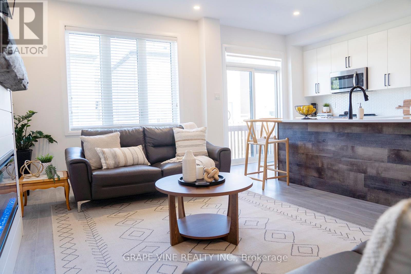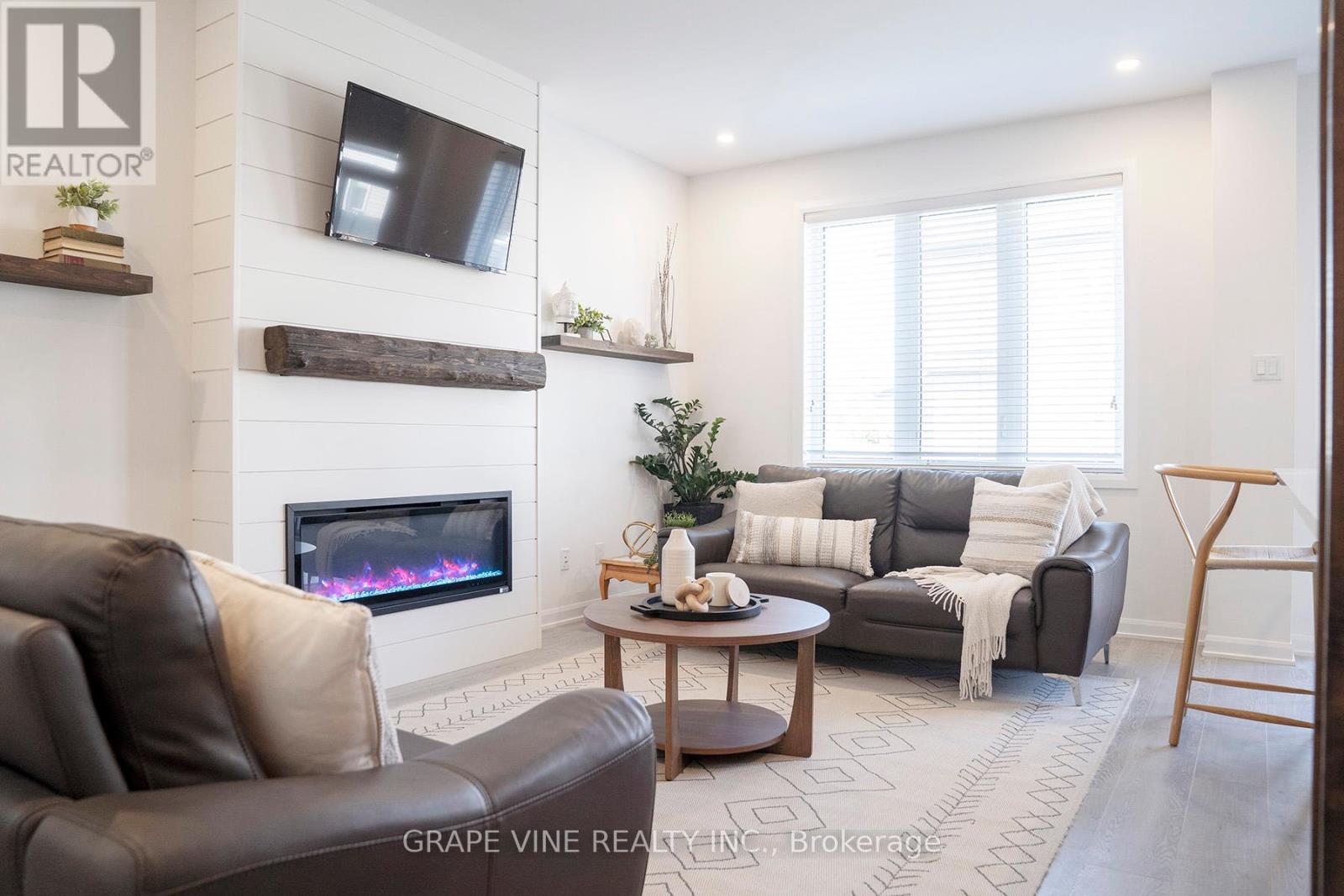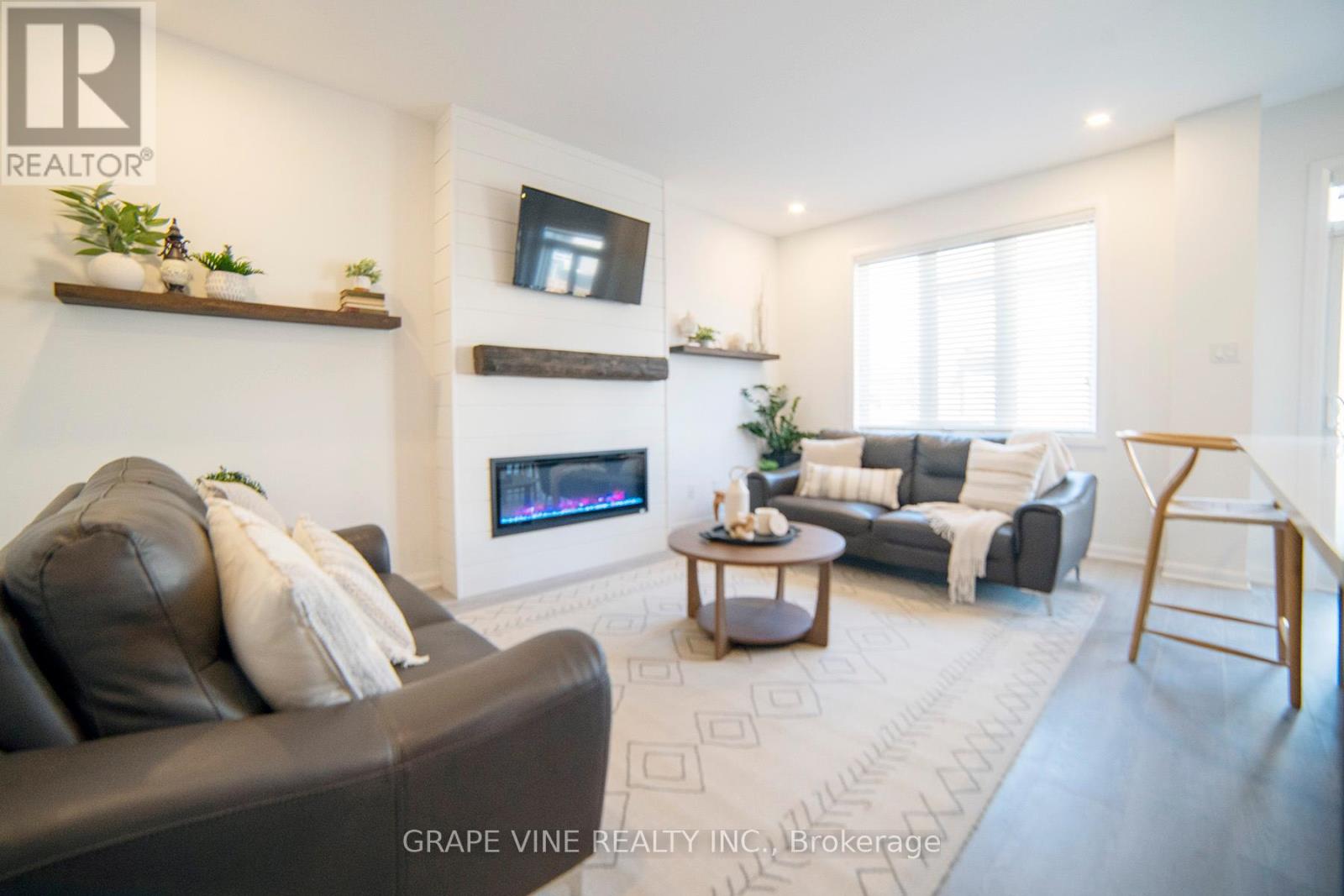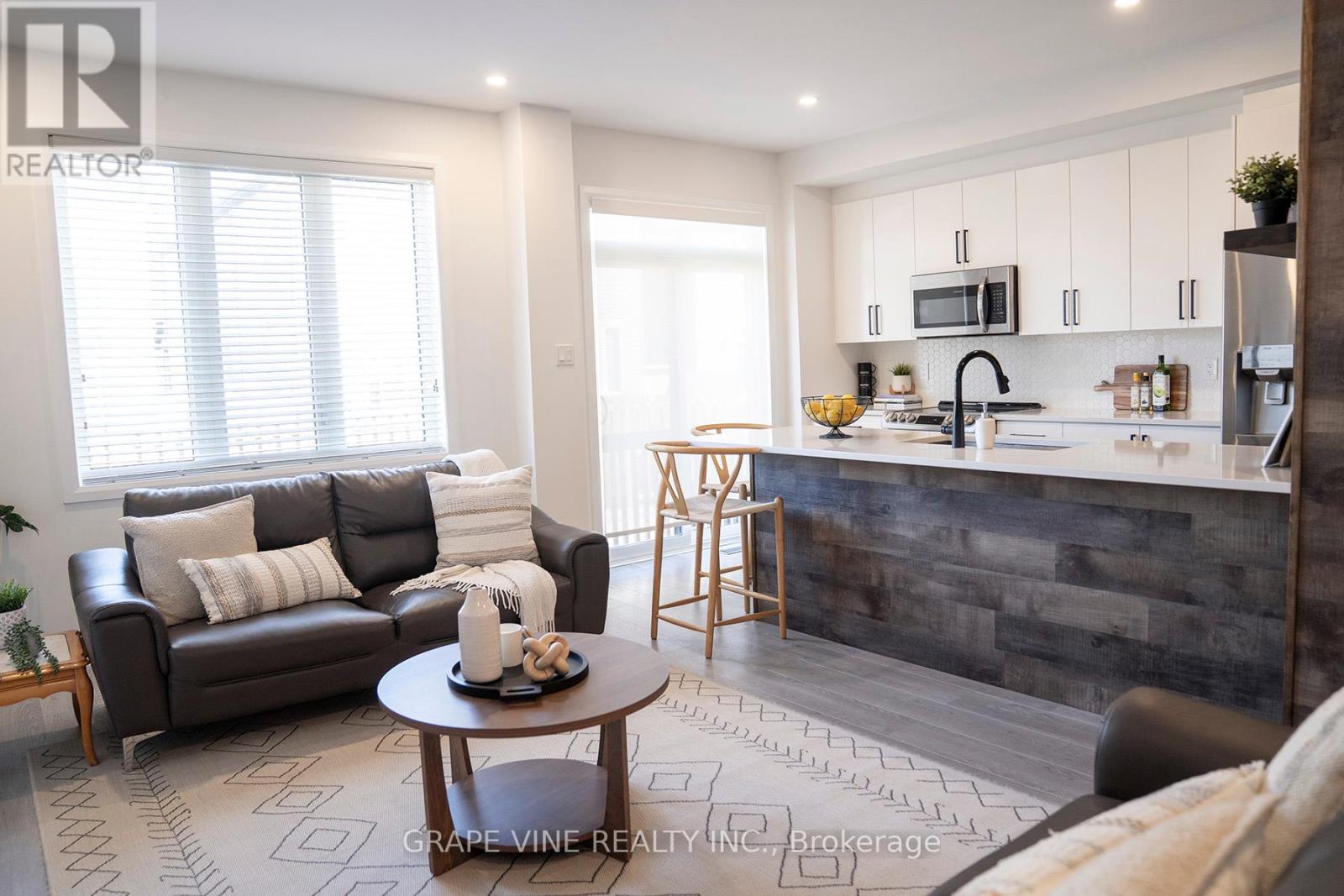 Welcome to this beautiful upgraded, move-in ready 3-bedroom contemporary townhome featuring $60K+ in premium upgrades. High-end laminate flooring throughout, including the finished basement. The open-concept kitchen boasts quartz counters, an oversized island, sleek backsplash & stainless steel appliances, perfect for entertaining. Bright living room with large windows & custom fireplace with rustic beam mantel and board-and-batten detail. Upstairs offers a spacious primary suite with walk-in closet & spa-like ensuite, plus two bright south-facing bedrooms and a full bath. Additional upgrades include quartz counters in all baths, pot lights, California shutters, custom roller blinds, upgraded hardware thruout + iron spindle staircase, customized lighting, eavestroughs, w/d and more. Steps to schools, transit, shopping, parks, & rec centre. A stylish, sun-filled home in a welcoming family community. (id:49063)