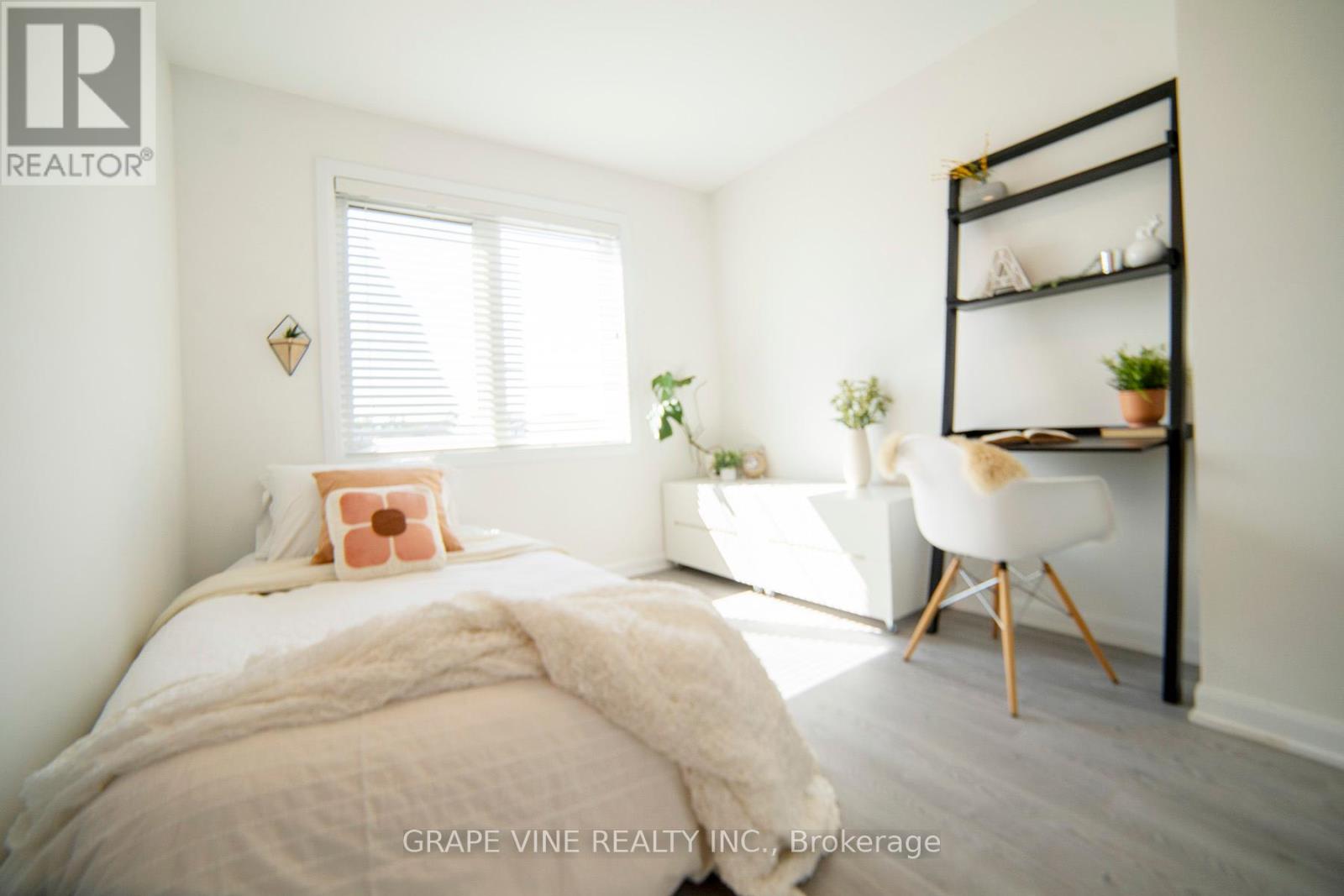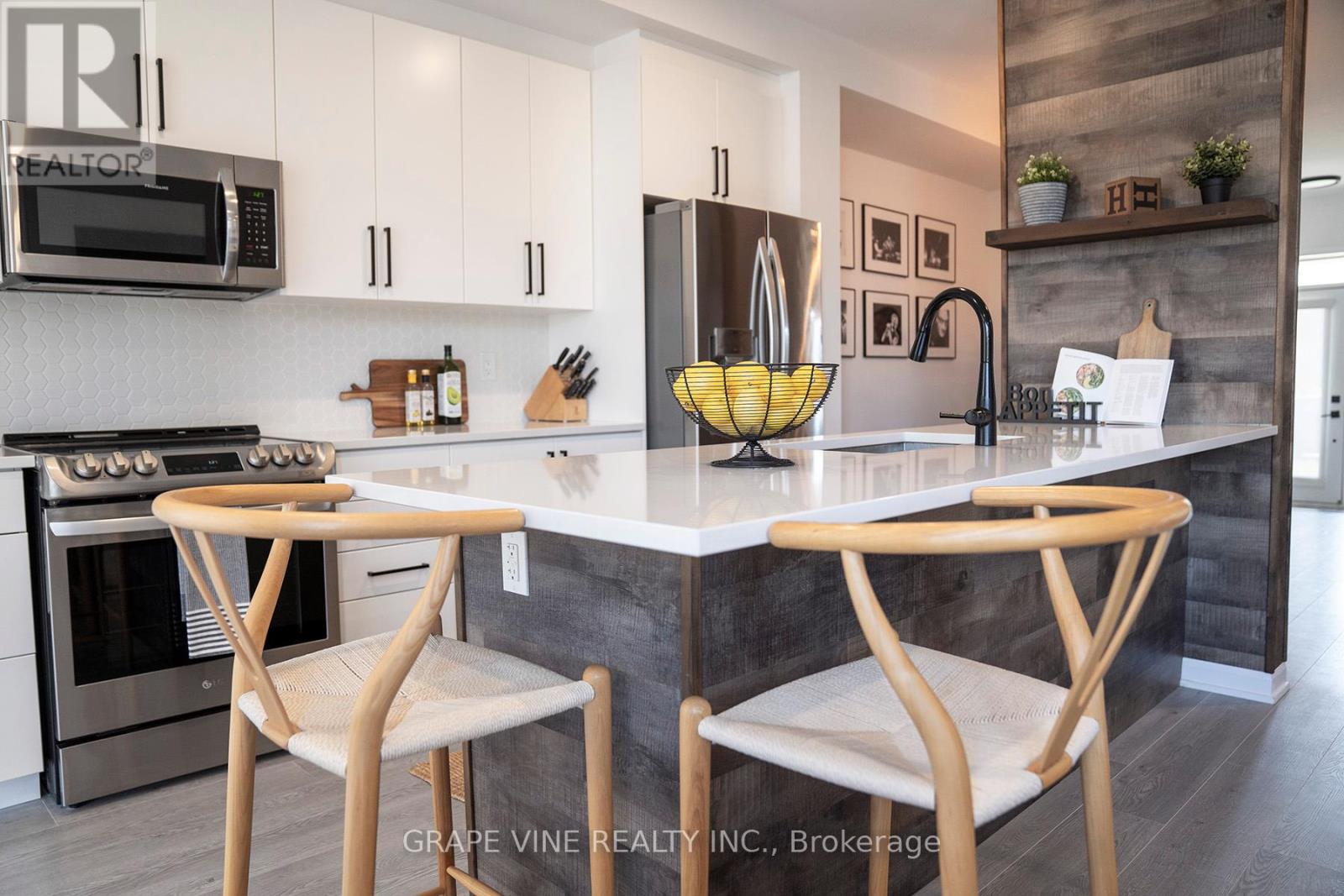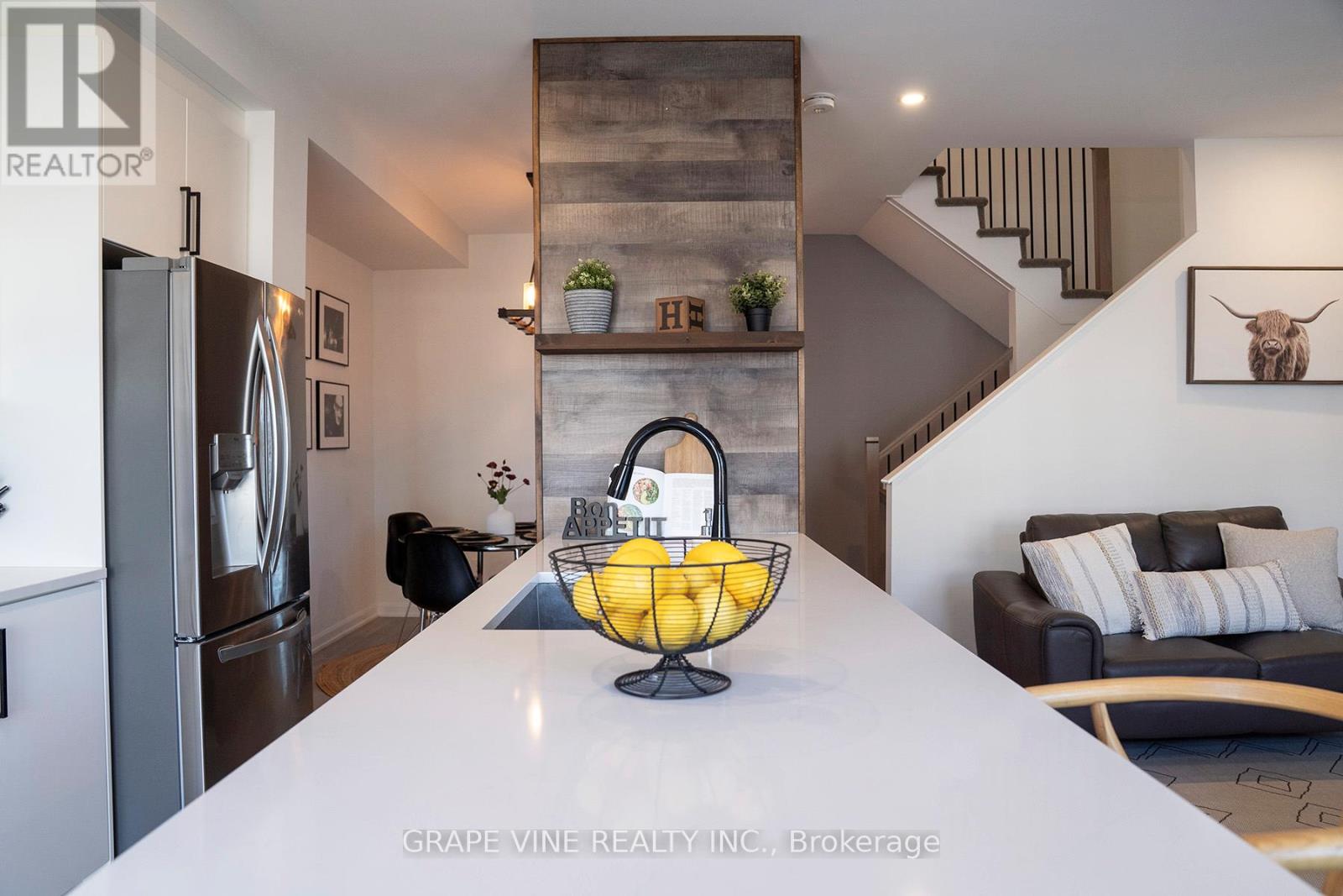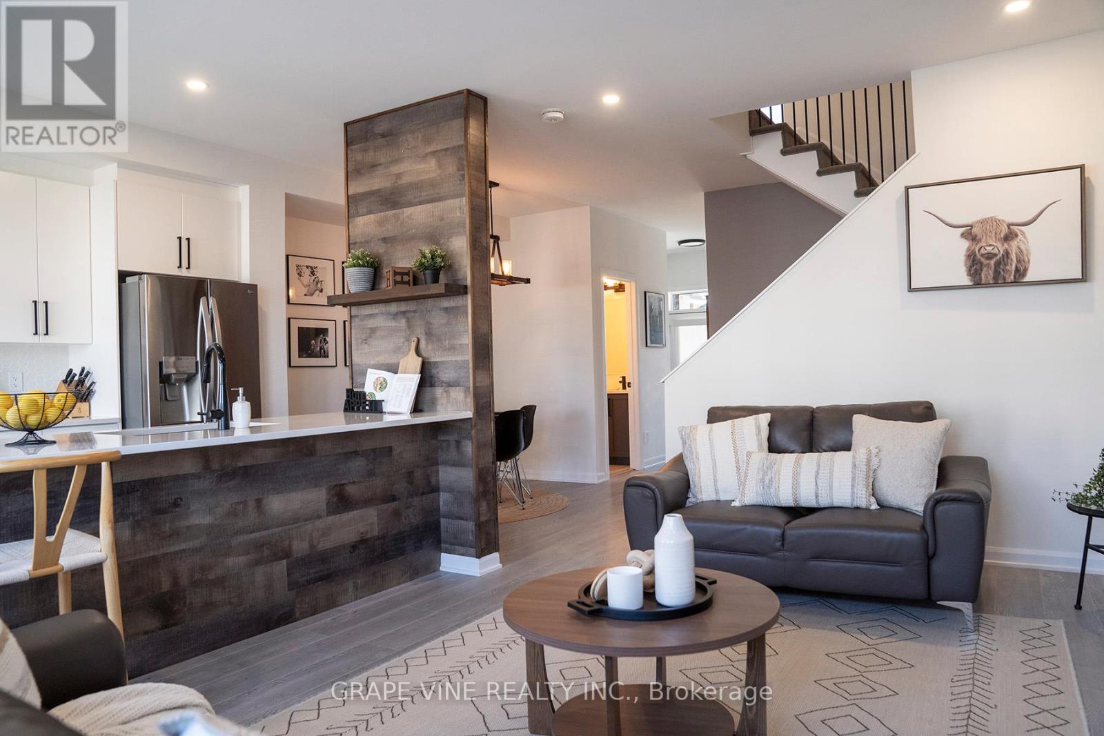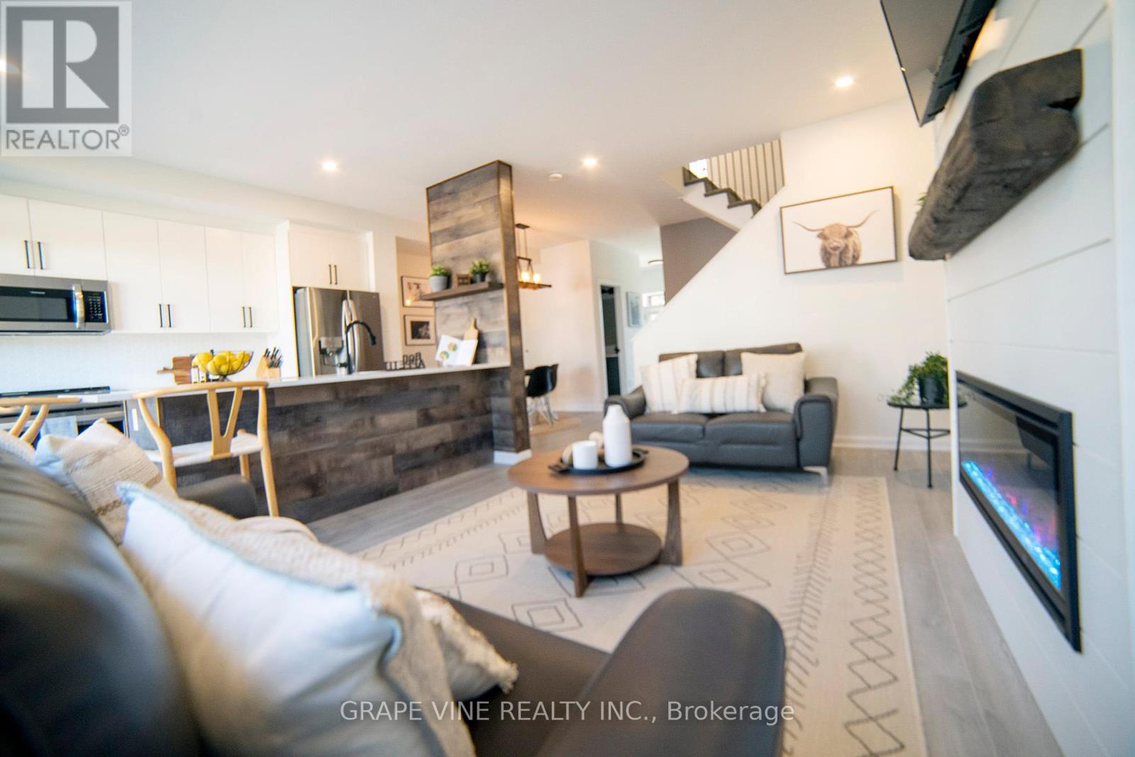 Welcome to this beautiful upgraded, move-in ready 3-bedroom contemporary townhome featuring $60K+ in premium upgrades. High-end laminate flooring throughout, including the finished basement. The open-concept kitchen boasts quartz counters, an oversized island, sleek backsplash & stainless steel appliances, perfect for entertaining. Bright living room with large windows & custom fireplace with rustic beam mantel and board-and-batten detail. Upstairs offers a spacious primary suite with walk-in closet & spa-like ensuite, plus two bright south-facing bedrooms and a full bath. Additional upgrades include quartz counters in all baths, pot lights, California shutters, custom roller blinds, upgraded hardware thruout + iron spindle staircase, customized lighting, eavestroughs, w/d and more. Steps to schools, transit, shopping, parks, & rec centre. A stylish, sun-filled home in a welcoming family community. (id:49063)