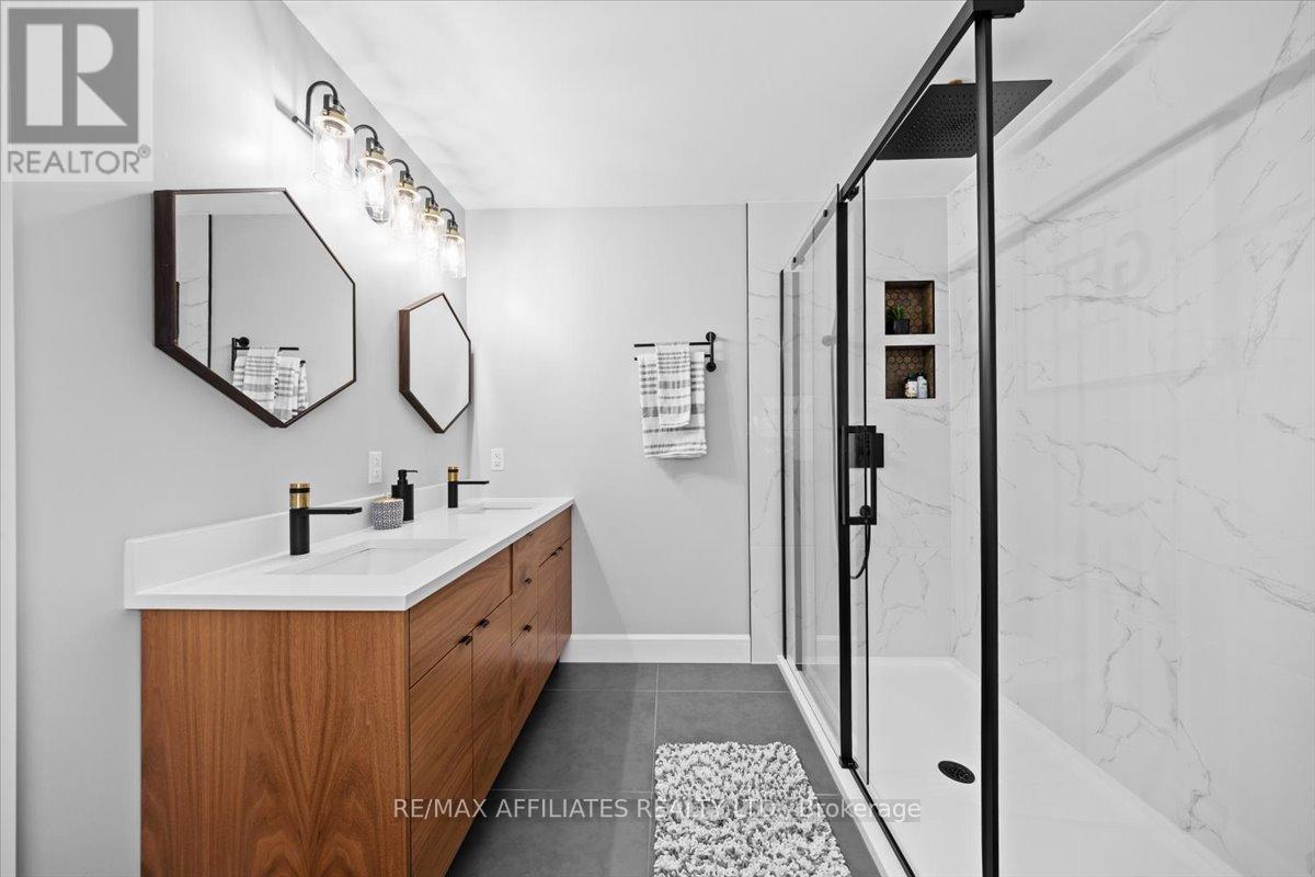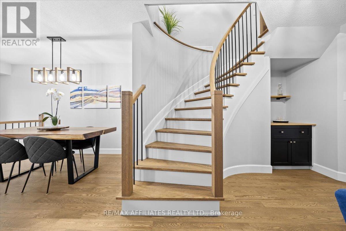 Beautifully Renovated 3-Bedroom Home in Breezewood - Modern Luxury ThroughoutWelcome to this stunning, fully renovated 3-bedroom home in the desirable Breezewood community. Built in 2004 and upgraded with high-end finishes in 2020, this property offers the feel of a new-build home without the new-build price tag.The main level features a bright open-concept layout with 4" solid wide-plank red oak hardwood, custom trim work, solid core interior doors, updated lighting, and a modern curved staircase with wrought-iron spindles. The living room showcases a custom fireplace with a natural quartz stone surround, a cultured stone backdrop, and a white oak mantel with floating shelves. The chef-inspired kitchen includes quartz countertops, soft-close cabinetry, stainless steel appliances (2020), tile backsplash, and a deep stainless steel undermount sink. Patio doors open to a fully fenced backyard with no rear neighbours, a large deck, and a peaceful, treed setting.Upstairs, you'll find three generous bedrooms, including a spacious primary suite with a walk-in closet, a feature wall, and a luxurious ensuite complete with heated floors, dual sinks, porcelain tile, a walnut vanity with quartz top, and a custom walk-in shower. The updated 4-piece main bathroom also features modern porcelain tile. The third bedroom offers beautiful vaulted ceilings.The finished lower level includes engineered white oak hardwood, a custom bar nook, a laundry room, and a rough-in for a future bathroom.Major updates include: Roof (2019), Furnace (2018), Hot Water Tank (2021), Appliances (2020), Attic Insulation R60 (2023), and New Interlock (2025).Located close to schools, parks, recreation, grocery stores, restaurants, and public transit. A beautifully crafted home in an outstanding community-move in and enjoy. (id:49063)
