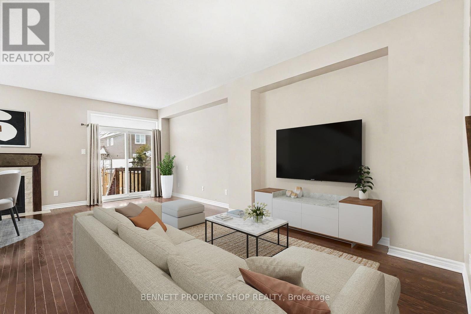 Welcome to this beautifully designed Tamarack Huntington model end unit townhome offering 2,121 sq ft of thoughtfully planned living space, including 411 sq ft in the finished lower level. Built as an Energy Star certified home, this property combines efficiency, comfort, and quality construction. The bright open concept main floor features 9 foot ceilings, oak hardwood flooring, and large windows that allow natural light to flow throughout the living and dining areas. The welcoming entrance is finished with ceramic tile, while the kitchen is both stylish and functional, showcasing Muskoka custom crafted cabinetry, ceramic finishes, a walk in pantry, and seamless flow into the main living space. A cozy gas fireplace anchors the room, making it ideal for everyday living and entertaining. The second level offers an oversized primary bedroom complete with a private ensuite, along with two additional generously sized bedrooms and a versatile loft or den that works perfectly as a home office, homework area, or quiet sitting space. Convenient second floor laundry adds to the thoughtful layout. The finished lower level provides additional living space with a spacious recreation room, ideal for movie nights, a play area, or a comfortable retreat, complete with a second fireplace. Outside, the fully fenced backyard offers privacy and functionality, featuring a deck ideal for outdoor dining or relaxing, along with a backyard shed for added storage. Located in the desirable Jackson Trails community of Stittsville North, this home is within walking distance to schools, parks, public transit, shopping, and restaurants, offering an excellent balance of convenience and community. A fantastic opportunity to own a well appointed townhome in a sought after neighbourhood. 24 hours irrevocable on all offers. Some photos are digitally enhanced. (id:49063)