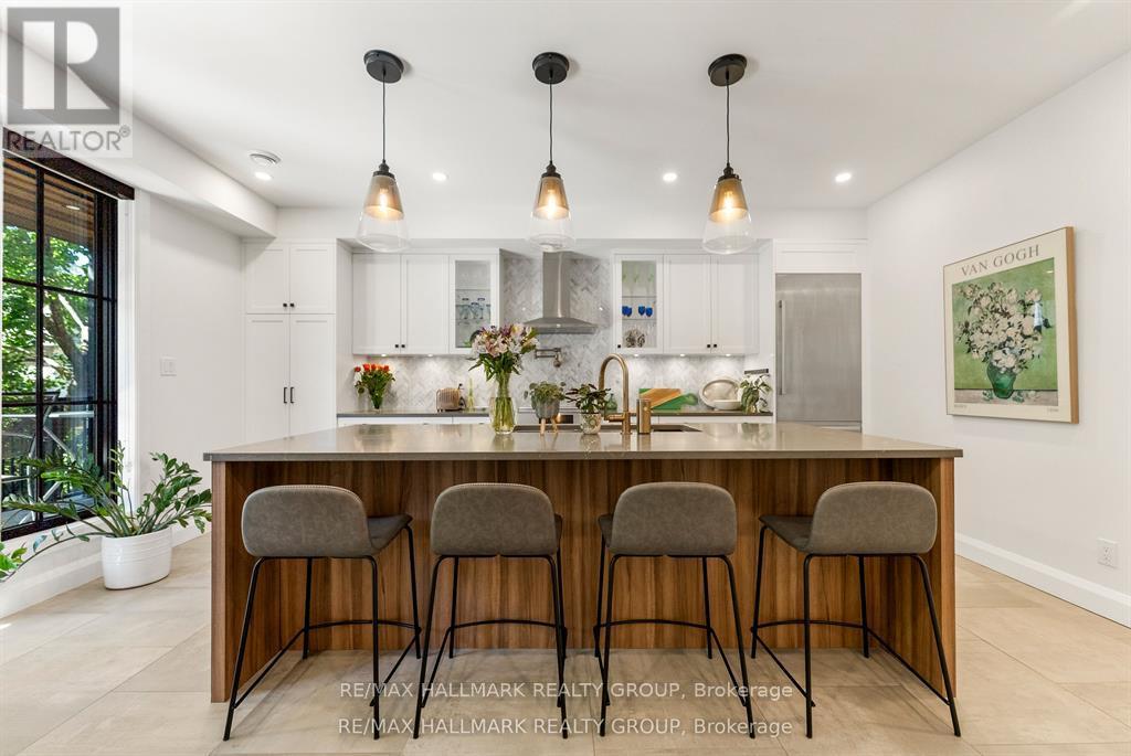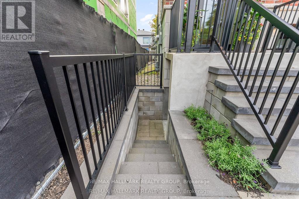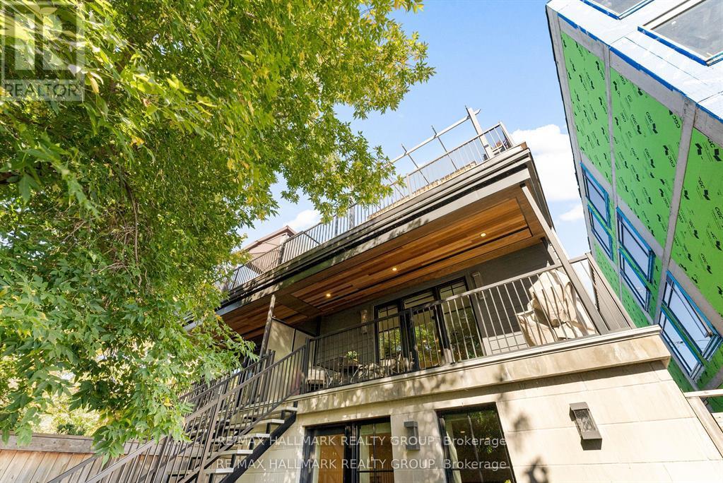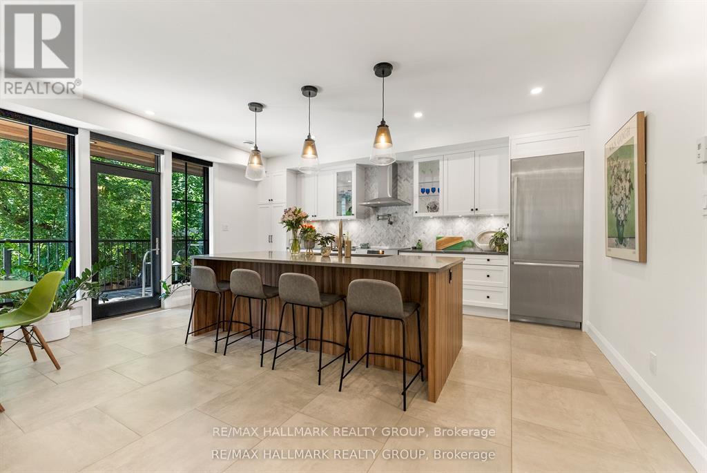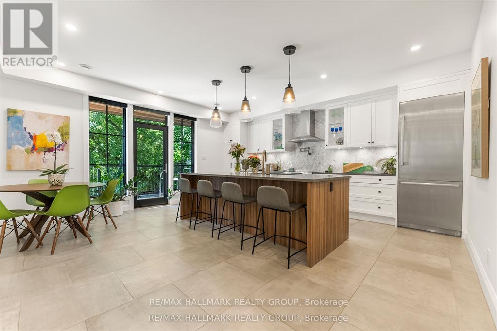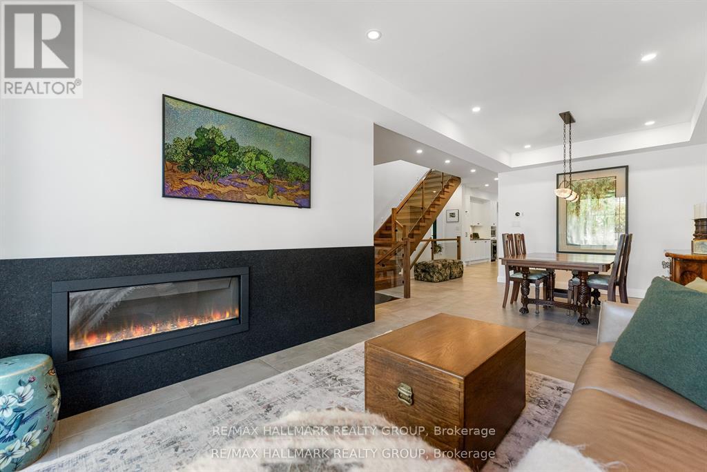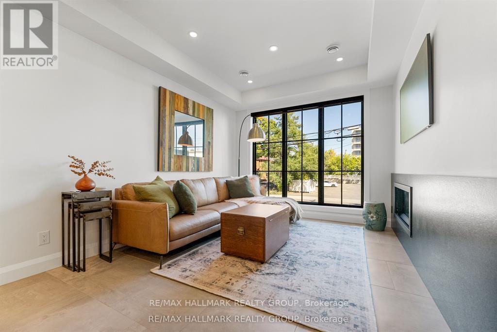 Welcome to your exquisite New York-style brownstone nestled in the vibrant Westboro Village.This stunning residence offers an unparalleled lifestyle for those who cherish the art of living.Step outside and find yourself within walking distance of the finest restaurants, boutique shops, or explore your culinary skills with fresh, local ingredients from the summer Farmers Market around the corner.Enter through an exterior heated floor into a foyer crowned by a compass-inspired chandelier. Glass and walnut railings lead to a living area anchored by a leathered granite-slab fireplace and a Frame TV for rotating art display while the dining room dazzles under custom lighting.For those who love to cook, the kitchen is a culinary dream come true.It boasts an oversized island and a delightful dining alcove, equipped with high-end Bosch appliances, a wine fridge, a chef's sink, and ample storage.Picture yourself gather for summer evening barbecues and dine al fresco on the inviting porch, while radiant in-floor heating ensures year-round comfort.A skylit,illuminated stairway rises to the upper level, where you'll find the spacious primary suite with its luxurious dressing area and a black-and-white tiled ensuite with heated floors and skylight. Step outside onto your private exterior deck, perfect for summer lounging.Two additional bedrooms feature walnut floors. A beautifully appointed bathroom showcases in-floor heating & skylight.Dedicated laundry room adds daily ease.Discover versatile living on the lower level, complete with a private entrance, full-height windows and direct access to a charming backyard. Enjoy heated polished concrete floors, stunning bathroom with washer/dryer & roughed-in plumbing for a bar or kitchen, making this an ideal in-law suite.Constructed with reinforced concrete, cold-formed steel and an acid-washed brick exterior, plus a snow-melting driveway, this home blends lasting strength with refined aesthetics.Embrace the Westboro Village lifestyle! (id:49063)