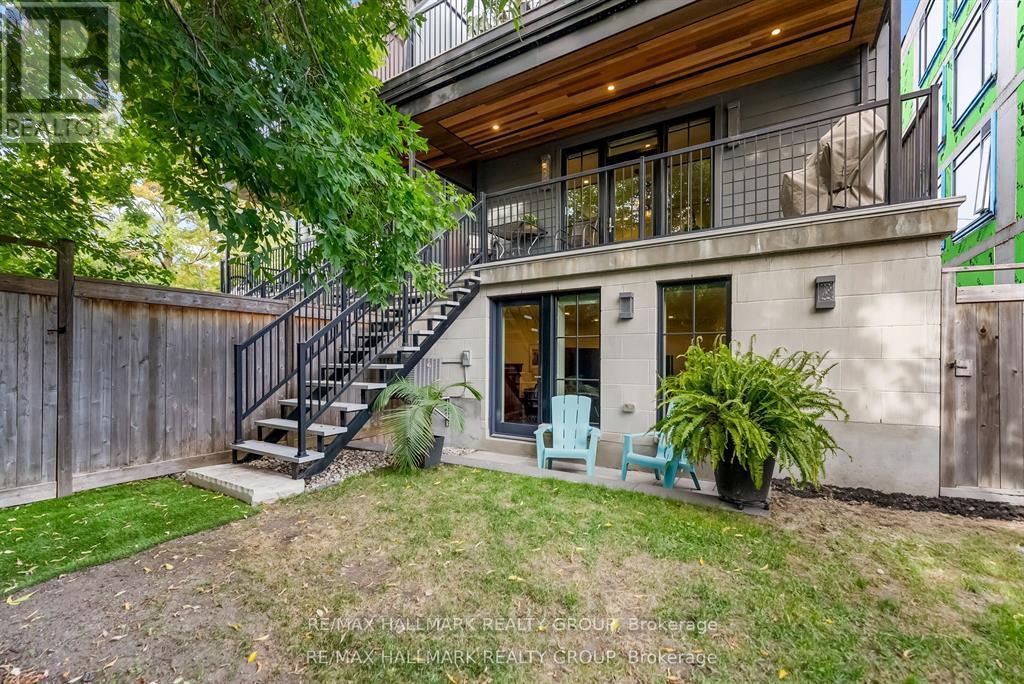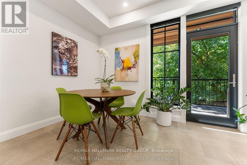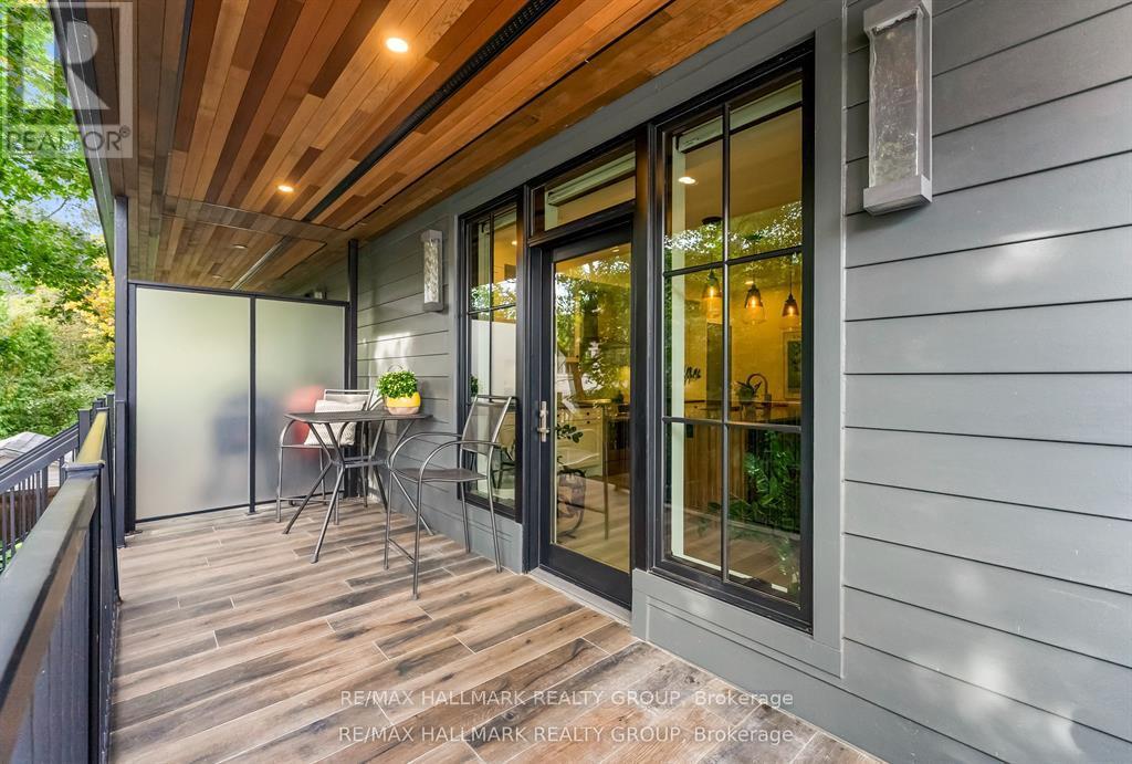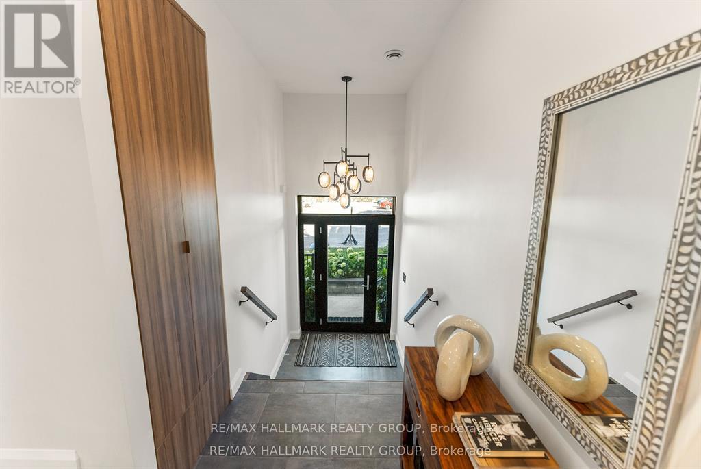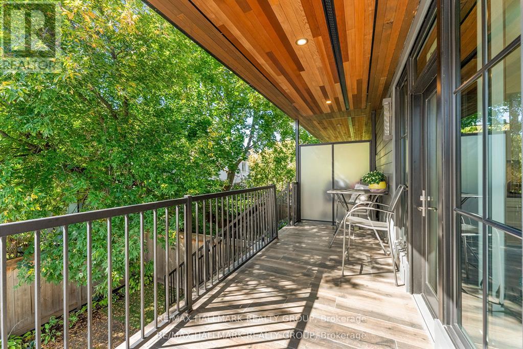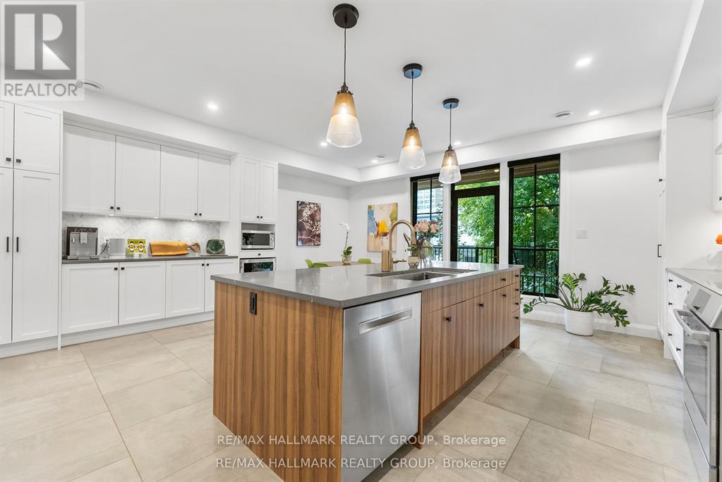Welcome to your exquisite New York-style brownstone nestled in the vibrant Westboro Village.This stunning residence offers an unparalleled lifestyle for those who cherish the art of living.Step outside and find yourself within walking distance of the finest restaurants, boutique shops, or explore your culinary skills with fresh, local ingredients from the summer Farmers Market around the corner.Enter through an exterior heated floor into a foyer crowned by a compass-inspired chandelier. Glass and walnut railings lead to a living area anchored by a leathered granite-slab fireplace and a Frame TV for rotating art display while the dining room dazzles under custom lighting.For those who love to cook, the kitchen is a culinary dream come true.It boasts an oversized island and a delightful dining alcove, equipped with high-end Bosch appliances, a wine fridge, a chef's sink, and ample storage.Picture yourself gather for summer evening barbecues and dine al fresco on the inviting porch, while radiant in-floor heating ensures year-round comfort.A skylit,illuminated stairway rises to the upper level, where you'll find the spacious primary suite with its luxurious dressing area and a black-and-white tiled ensuite with heated floors and skylight. Step outside onto your private exterior deck, perfect for summer lounging.Two additional bedrooms feature walnut floors. A beautifully appointed bathroom showcases in-floor heating & skylight.Dedicated laundry room adds daily ease.Discover versatile living on the lower level, complete with a private entrance, full-height windows and direct access to a charming backyard. Enjoy heated polished concrete floors, stunning bathroom with washer/dryer & roughed-in plumbing for a bar or kitchen, making this an ideal in-law suite.Constructed with reinforced concrete, cold-formed steel and an acid-washed brick exterior, plus a snow-melting driveway, this home blends lasting strength with refined aesthetics.Embrace the Westboro Village lifestyle! (id:49063)