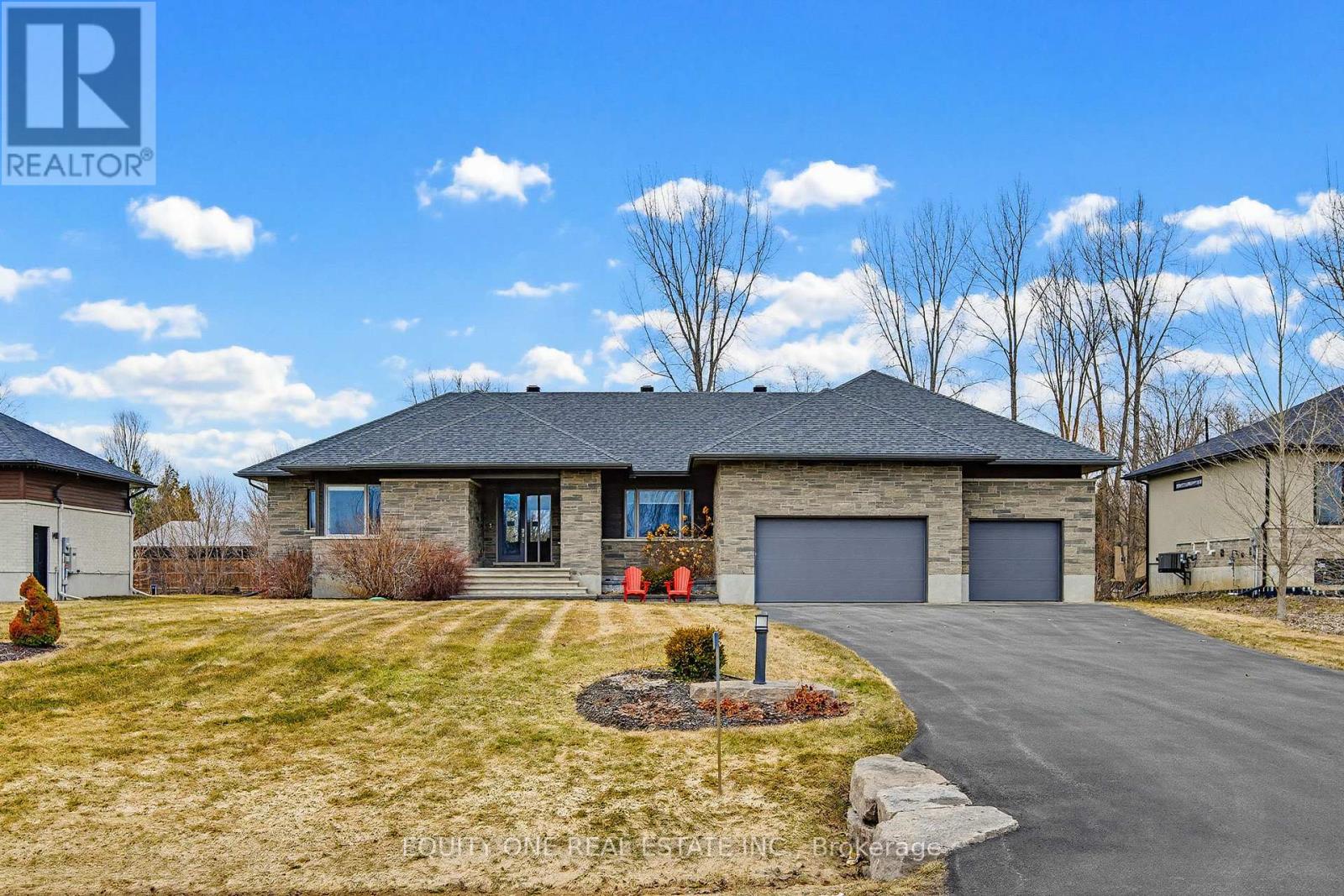 Welcome to this spectacular 4+1 bedroom, 4 bathroom bungalow in the highly sought-after Lakewood Trails community of Greely where modern luxury meets peaceful estate living. Built by Mackie Homes, this beautifully designed residence offers exceptional craftsmanship, thoughtful upgrades, and an ideal layout. The main level features a bright, open-concept design anchored by a stunning great room with a cozy natural gas fireplace, seamlessly flowing into a designer kitchen with quality cabinetry, stone countertops, and generous prep space ~ perfect for hosting family and friends. Designed for privacy, the primary suite is set on one side of the home, offering a peaceful retreat complete with his & hers walk-in closets and a luxurious ensuite featuring a freestanding soaker tub, glass shower, and heated floors. On the opposite side of the home, you'll find three additional well-sized bedrooms and a full bathroom-ideal for family living or guests. A spacious mudroom with built-in cabinetry provides excellent everyday storage and organization, while the main floor laundry room adds convenience and functionality.The fully finished lower level expands your living space with a large recreation area, dedicated exercise space, additional bedroom, and full bathroom. A separate theatre room with a second gas fireplace creates the perfect setting for movie nights and entertaining ~ ideal for multi-generational living or a private retreat. Car enthusiasts and families alike will appreciate the heated oversized 3-car garage, complete with built-in shelving for storage and direct access to the basement ~ an incredibly practical feature. Storage is abundant throughout the home, making it easy to stay organized and clutter-free. Outside, enjoy a beautifully landscaped backyard, rear patio, and upgraded exterior featuring stone and brick finishes, all set within one of Greely's most desirable communities featuring a community rec centre, pool and gym. Association fee of $350/year. (id:49063)