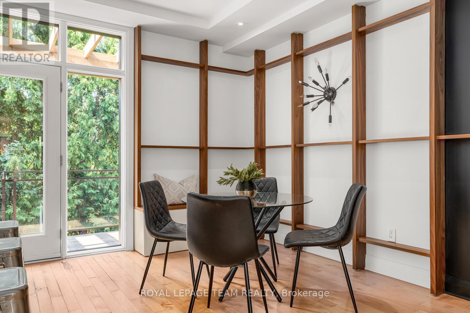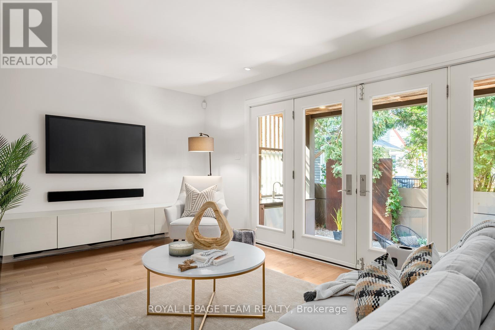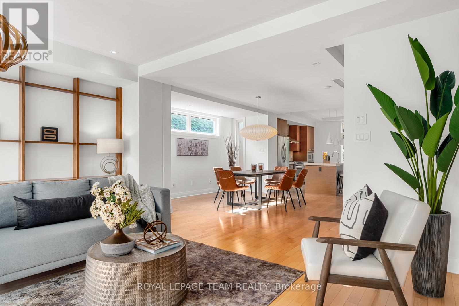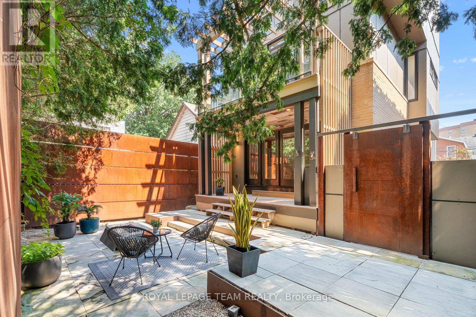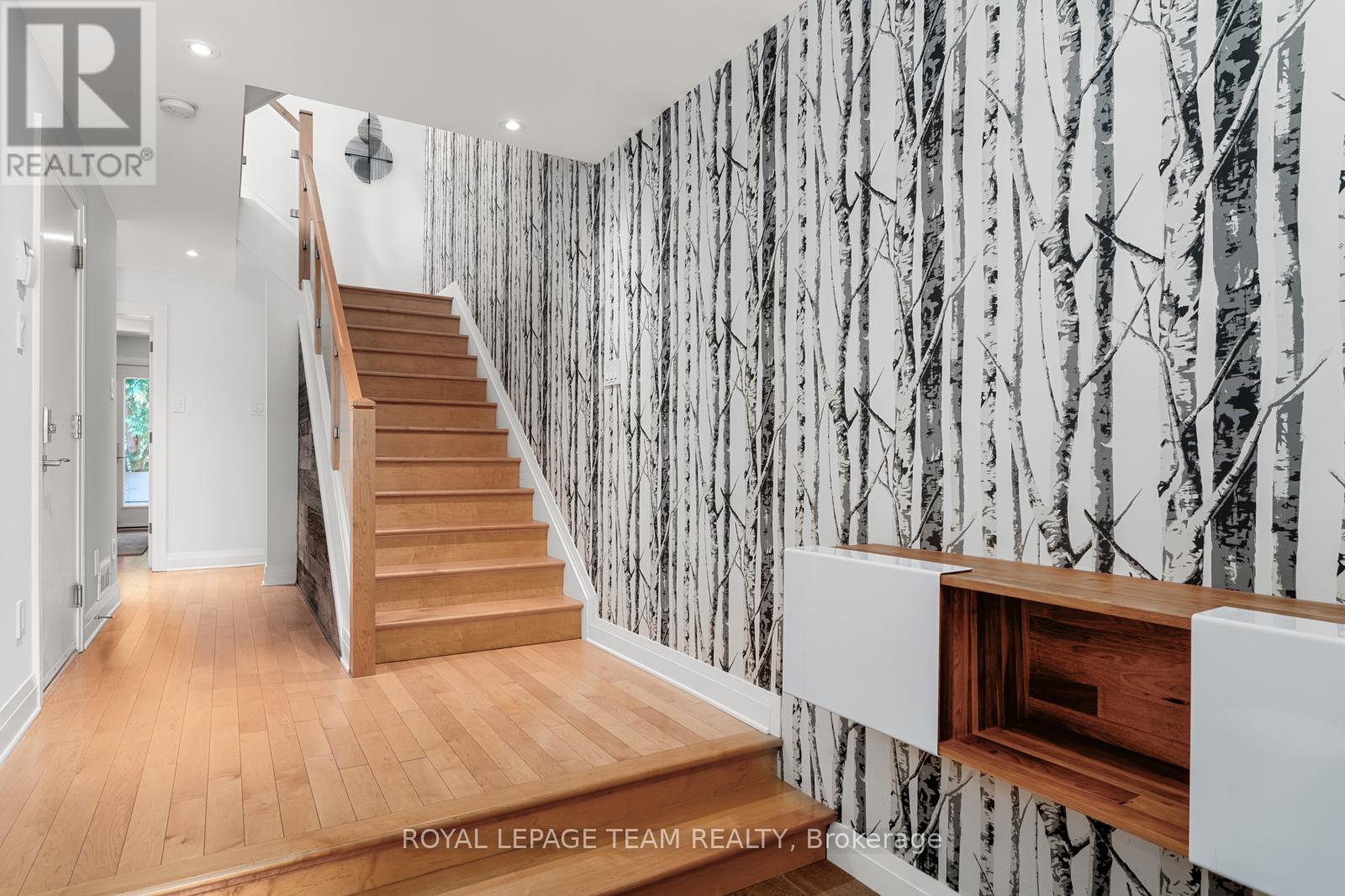 Bold, modern, and brilliantly located50 Bertrand is a luminous infill in historic New Edinburgh, steps from the dramatic Rideau Falls, riverside trails, and a footbridge to downtown. On the main floor, a sunlit family room opens to a private entertaining deck with built-in bar, overhead pot lights, and covered roofframed by tall cedars and fenced for privacy. The second level is made for gathering: chefs kitchen with quartz island, built-in wine bar, and terrace access flows into stunning living and dining space with sculptural lighting and sleek feature wall. Upstairs, the treetop primary suite offers a decadent ensuite and custom walk-in closet. Two additional bedrooms, large main bath, and spacious laundry room complete the top floor. Pale hardwood, high ceilings, and refined millwork carry throughout. A generous garage, deep lower-level storage, and polished spaces add everyday ease. Sophisticated, vibrant, and thoughtfully designed New Edinburgh living at its best. (id:49063)