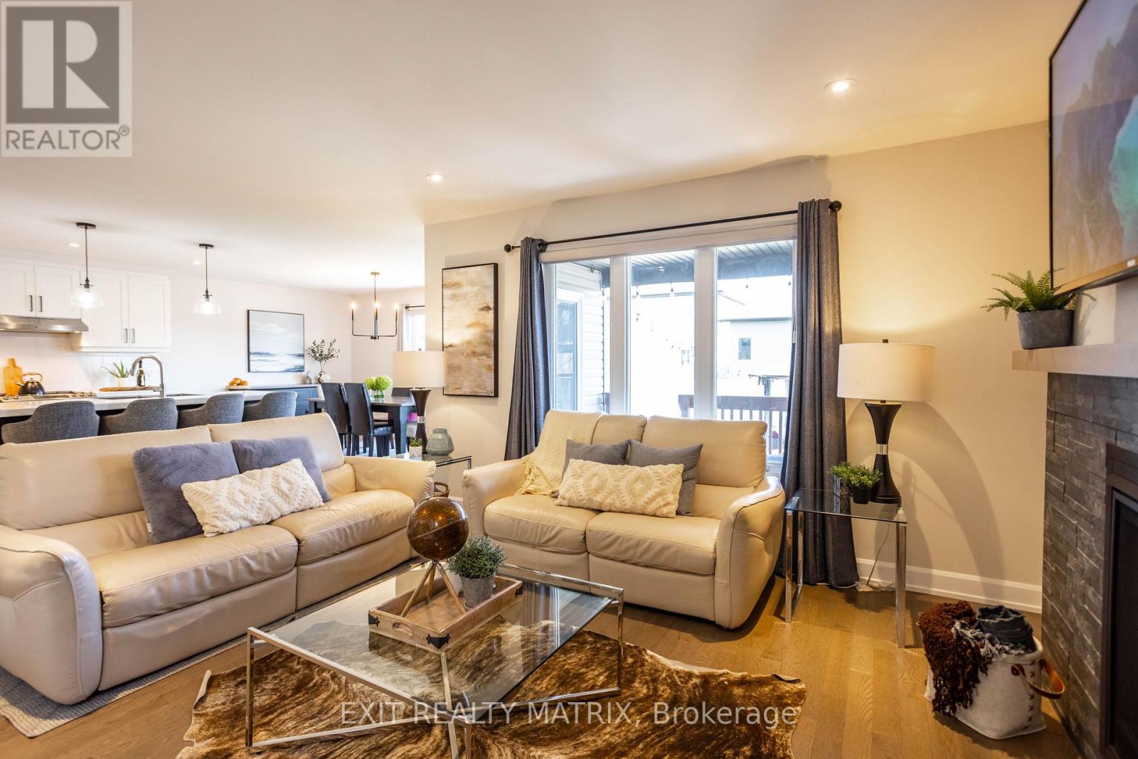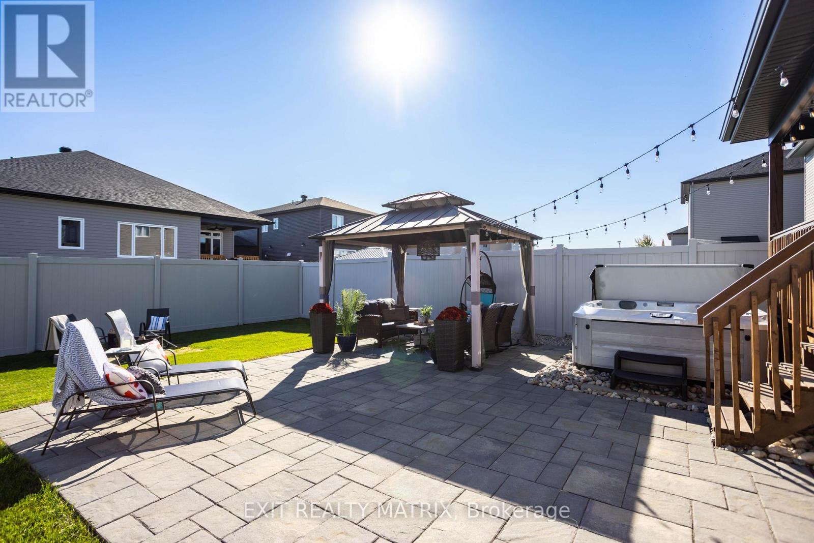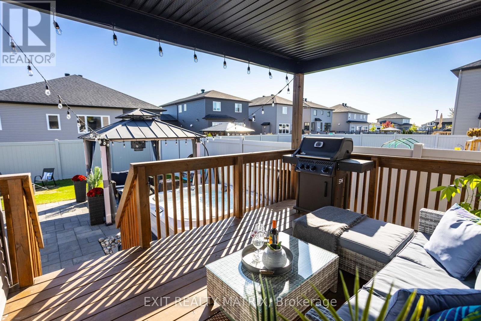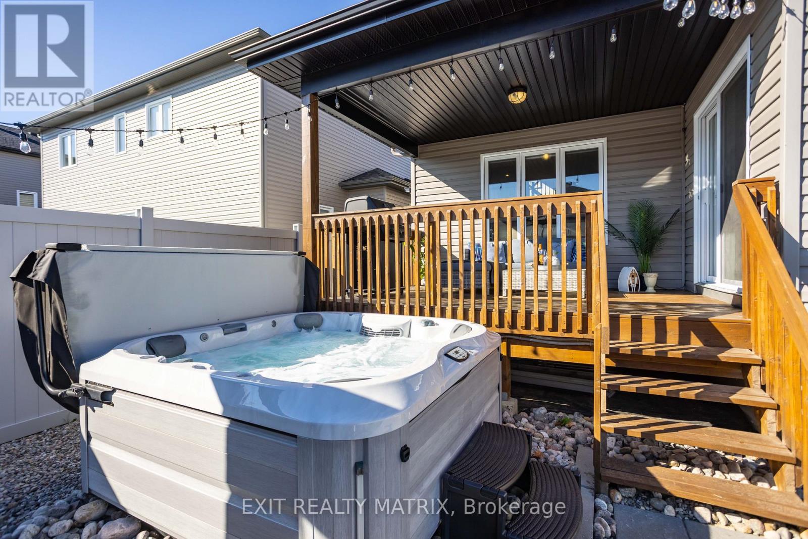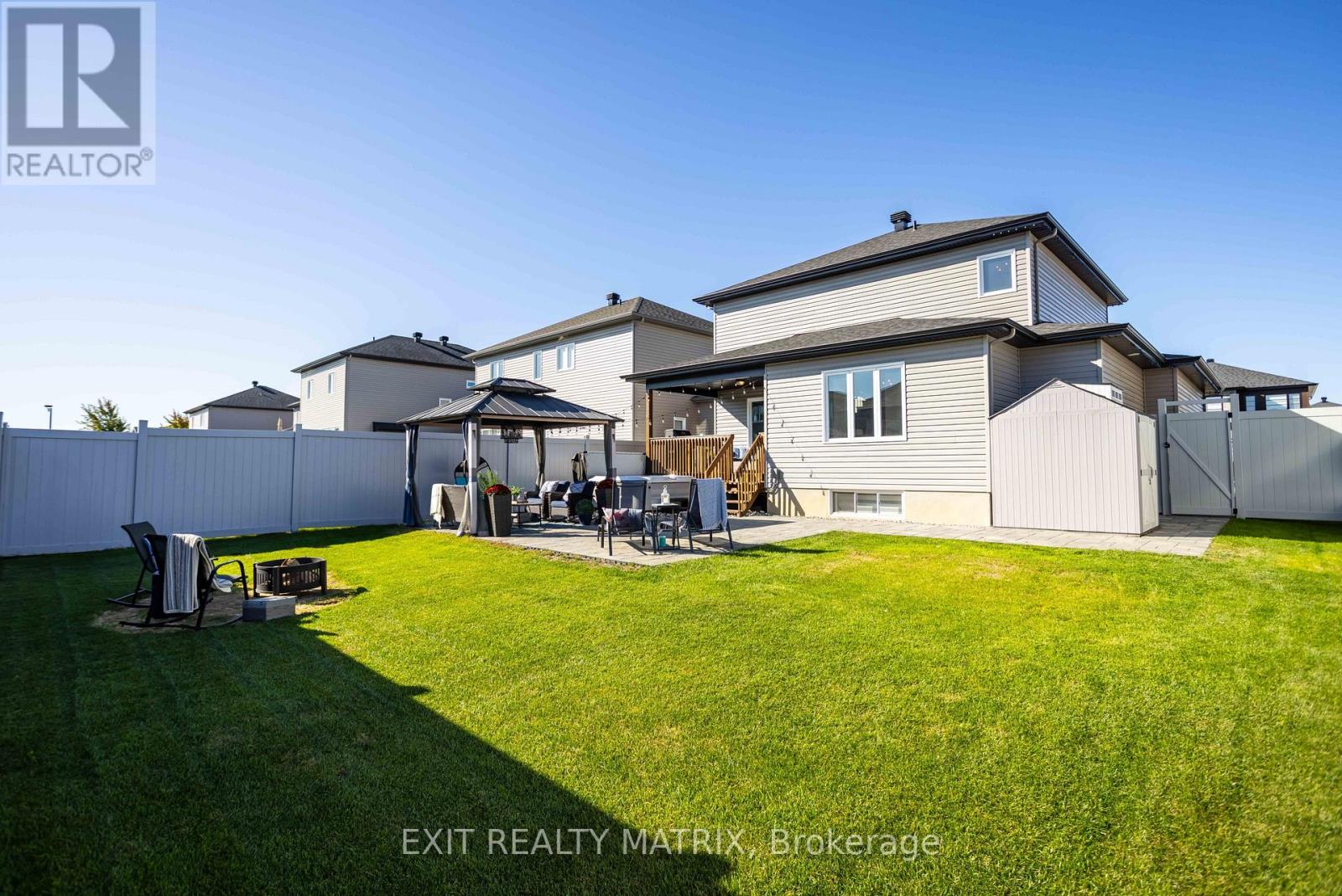 Welcome to 521 Marseille Street, a beautifully upgraded Melanie Construction modified Terracotta model designed to meet the needs of today's families. With 4 bedrooms and 4 bathrooms, this home offers the perfect blend of comfort, functionality, and flexibility, whether you're raising a family, accommodating multiple generations, running a home-based business, or exploring opportunities for rental income. Step into a bright and inviting foyer that flows seamlessly to a dedicated office and convenient half bath. Beyond, the main floor opens into a spacious living area anchored by a gas fireplace with a striking stone surround. The kitchen is a true centrepiece, featuring ceiling-height cabinetry, stainless steel appliances, a stylish centre island with seating for four, and a walk-in pantry. The dining room has been thoughtfully extended from the original builder's plan, creating an ideal space for gatherings and celebrations. Up the elegant hardwood staircase, the primary suite boasts a walk-in closet and a luxurious 4-piece ensuite. Two additional bedrooms, both with walk-in closets, and a full bathroom complete this level. The lower level offers incredible flexibility with its private exterior access. Currently set up for an aesthetics business, it includes a reception/rec area, treatment room, additional bedroom, and a full bathroom. With minimal modifications, it could serve as an extended living space, a spacious in-law suite, private guest quarters, or a rental unit that generates income. Outdoors, enjoy a fully fenced yard with an interlock patio, gazebo, hot tub, and a covered deck, perfect for year-round entertaining. Located in the welcoming community of Embrun, you're minutes from schools, shopping, recreation facilities, and parks, with an easy commute to Ottawa for work or play. This property combines small-town charm with modern convenience, making it an exceptional opportunity for today's lifestyle. (id:49063)