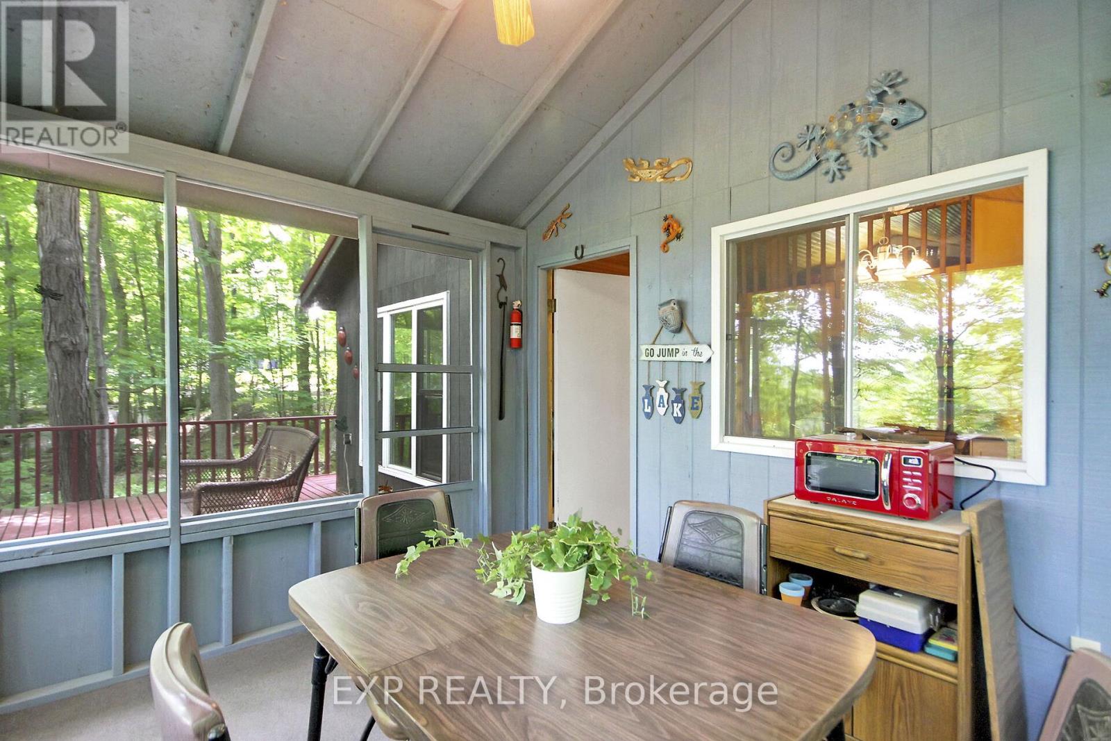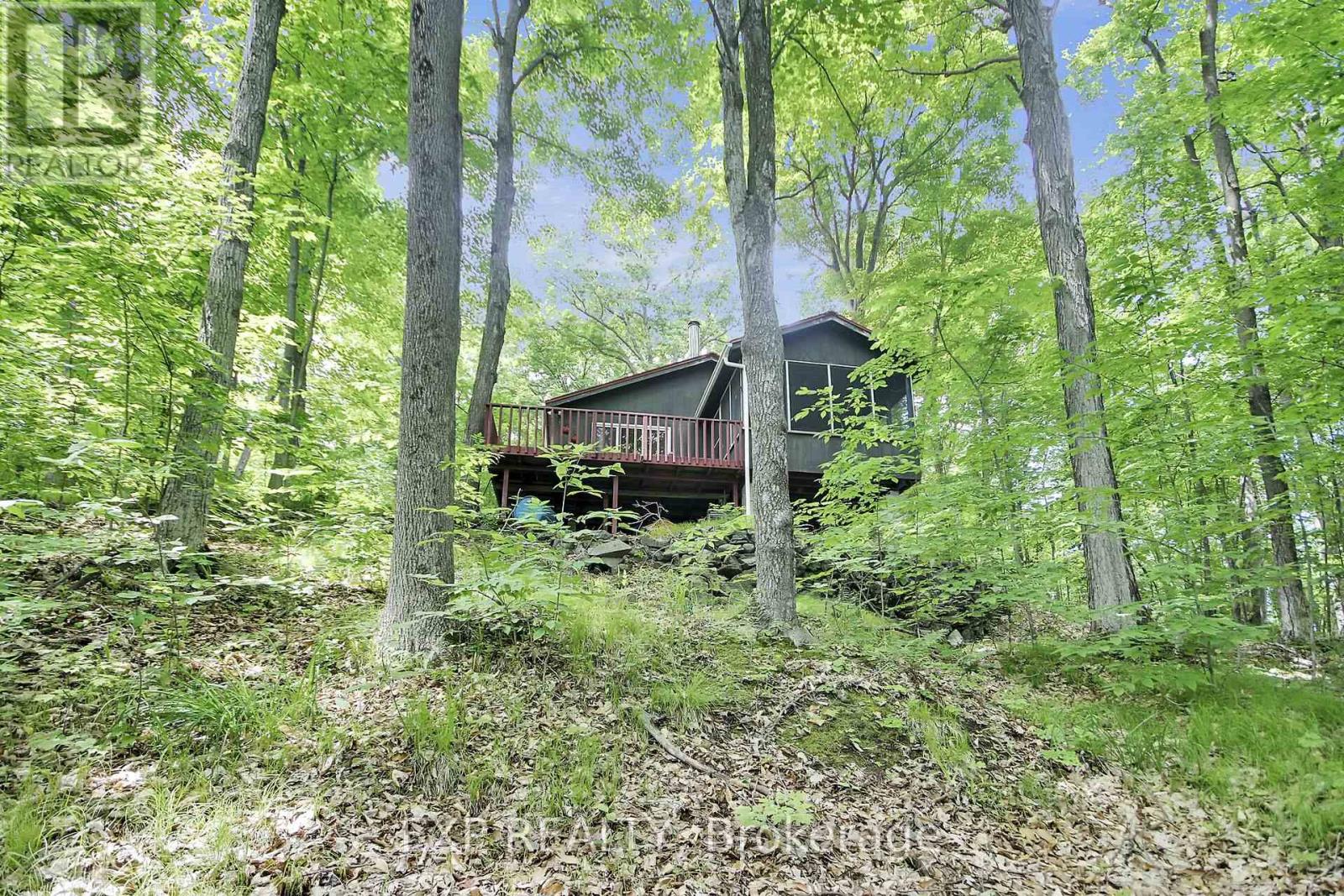 Charming Bobs Lake Waterfront Cottage: A Hidden Retreat Tucked beneath a canopy of towering oaks & beech trees, this enchanting cottage setting offers a true escape on the shores of one of Eastern Ontario's largest, lakes. Located an hour from Kingston and 1.5 hr. from Ottawa. It's an easy commute for weekend. The property carries a history of a previous mica exploration, the glimmering flakes are still visible in the forest floor. Now a more than 1.5 acres of secluded cottage heaven on located on a large rectangle with the cottage in the centre. A winding drive through the mature trees brings you to a spacious parking area ideal for your future garage or additional parking. You're welcomed by a cheerful red steel-roof building. Step out on the deck & take in the sweeping panorama of the lake, crystal clear waters framed by forest, untouched & serene. There is lots space between neighbours for privacy . Inside, rustic meets cozy. Vaulted ceilings & large newer windows bathe the open-concept kitchen with natural light. Two bedrooms plus an airy loft add room for guests or growing families, while the Jotul 910 wood stove cheers up autumn nights. The screened-in porch overlooks 93 feet of private shoreline ideal for summer dining, games, or evening glass of wine. Enjoy an outdoor bonfire roasting marshmallows with the kids. A newly terraced staircase leads to year round floating docks, perfect for boating, swimming, paddling, or simply soaking in the view. Great Bass fishing! The secluded south facing bay offers rare quiet, with minimal cross boat traffic. Modern updates include newer electrical (100-amp panel), a recently pumped septic, 2025. Offered turn key, fully furnished, with appliances as viewed. This getaway is ready for year-round use; ask for details. Just steps to nature & miles from stress, this is more than a cottage. Ideal for for the occasional cottage rental to pay the taxes. Its a story waiting for you. Hurry! (id:49063)