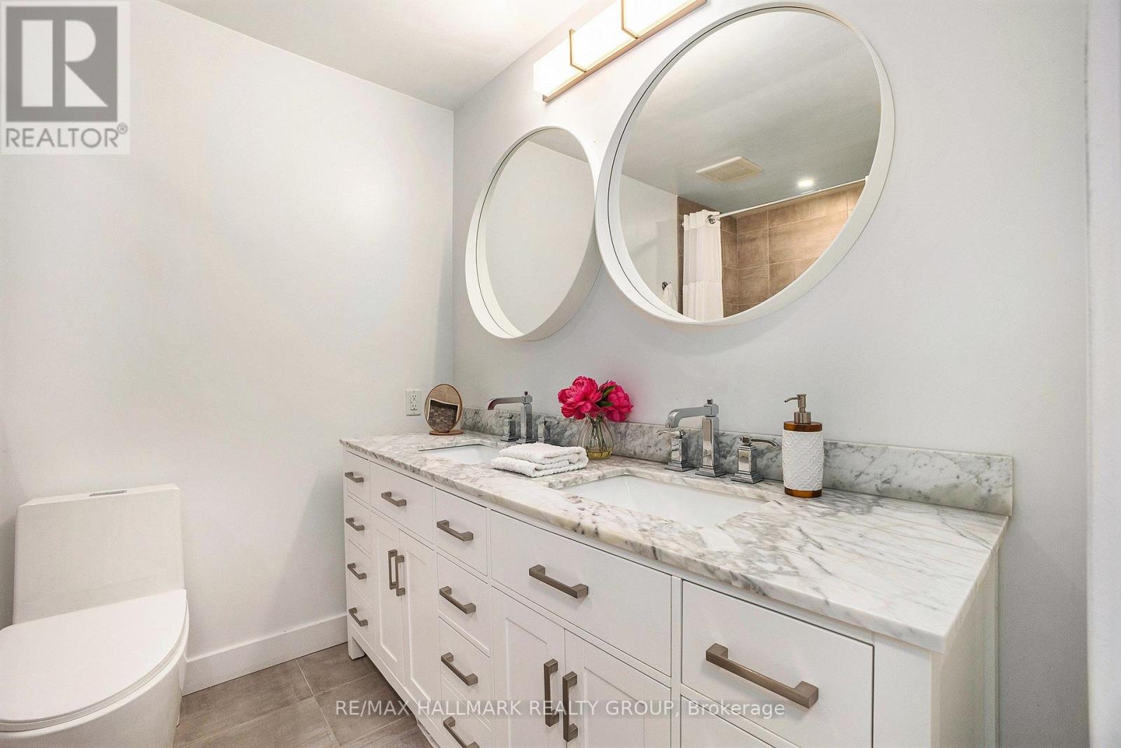 Welcome to this customized "Mid Century Modern" in sought after Beaverbrook Kanata. Walk to some of the cities best schools, leisure pathways, shopping & great dining options. This home offers the finest of finishes w environmentally conscious upgrades. Truly spacious 3 bedroom with 3 bedrooms on the lower level for guests, work or craft space or can be rented out as a full seperate suite for additional income. This home also has 3 full bathrooms including a full ensuite bathroom. The main level features rich hardwood floors, an open-concept layout, & a cozy wood-burning brick fireplace dividing the living and dining areas. Floor-to-ceiling windows fill the home w natural light, while a terrace door opens to an oversized deck w a gazebo a & private landscaped garden w mature trees & shrubbery-perfect for summer gatherings or quiet relaxation. The chef's kitchen boasts quartz counters, stainless steel appliances, ample cabinetry & counter space for food preparation. The layout continues w 3 bedrooms all w double or triple closets. The primary suite offers plenty of space for a king sized bedroom set & has 3 piece ensuite bathroom w a glass shower. The main bath room has double sinks, quartz counters & a full tub/shower. Looking for a mudroom? The entrance from the double garage allows lots of space for outerwear & the laundry is located here as well (second laundry on the lower level). Next is the finished lower level offering remarkable versatility. Heated floors throughout! Generous recreation room & media room, plus a full kitchen, 3 bedrooms, full bath, laundry -ideal for teens, multi-generational living, or an additional revenue stream (approx. $2,100/month)Notable upgrades: hydronic in-floor radiant heating on both levels, main-level heat pump for seasonal comfort, high-efficiency tankless water system, 200-amp electrical, updated plumbing & recently re-shingled roof. Complete with a spacious 2-car garage, this home blends timeless design w modern comfor (id:49063)