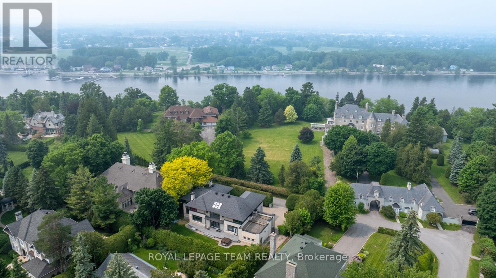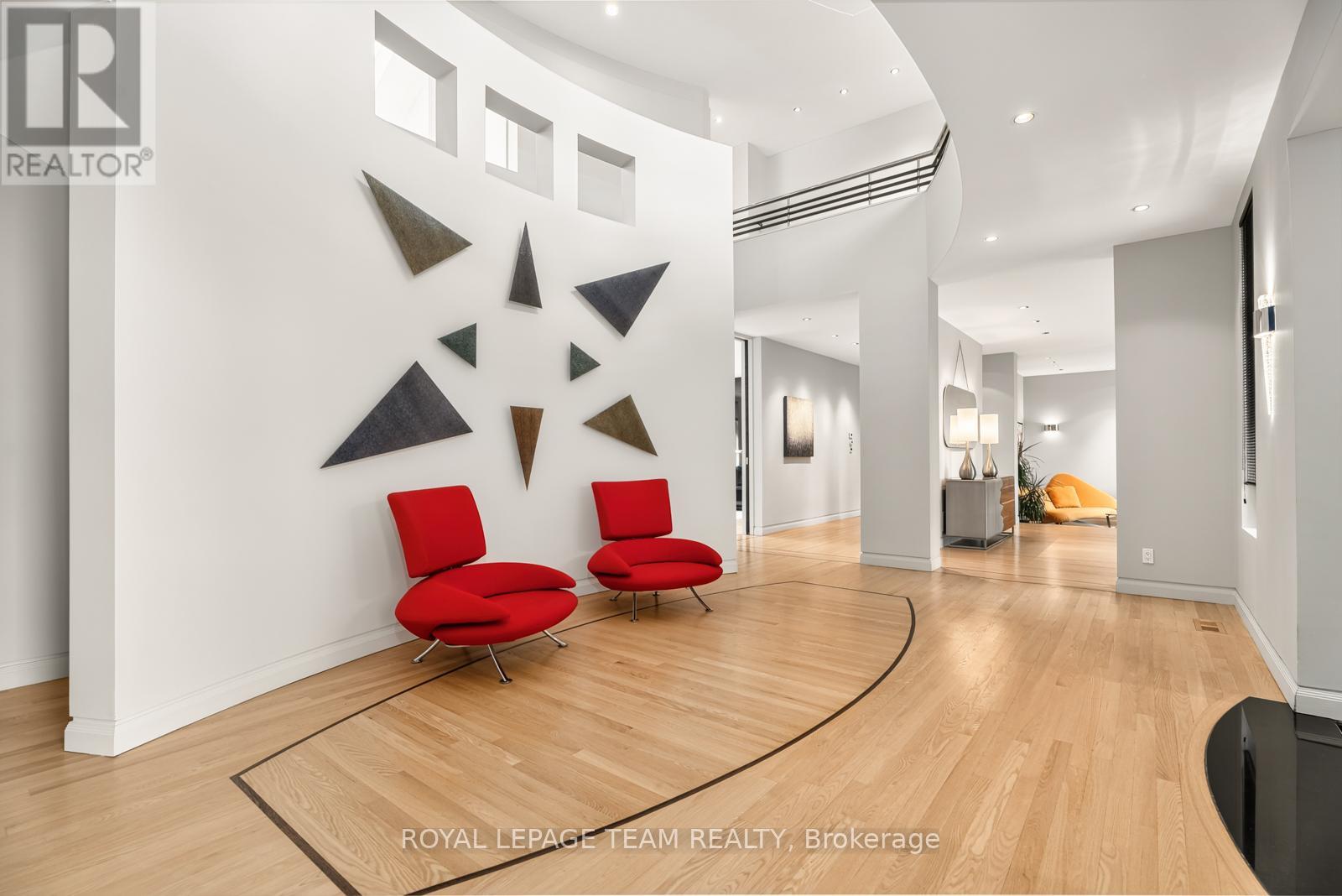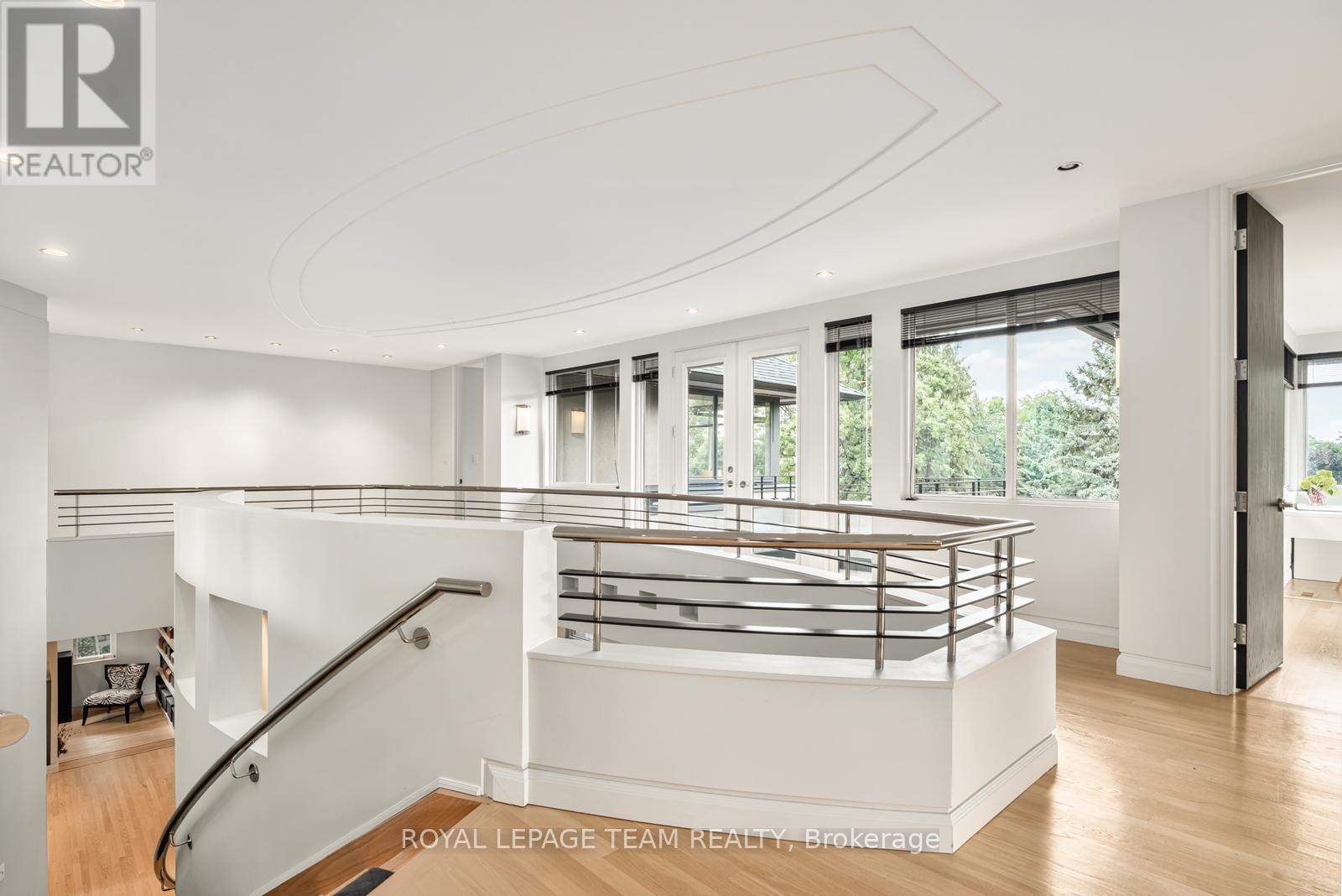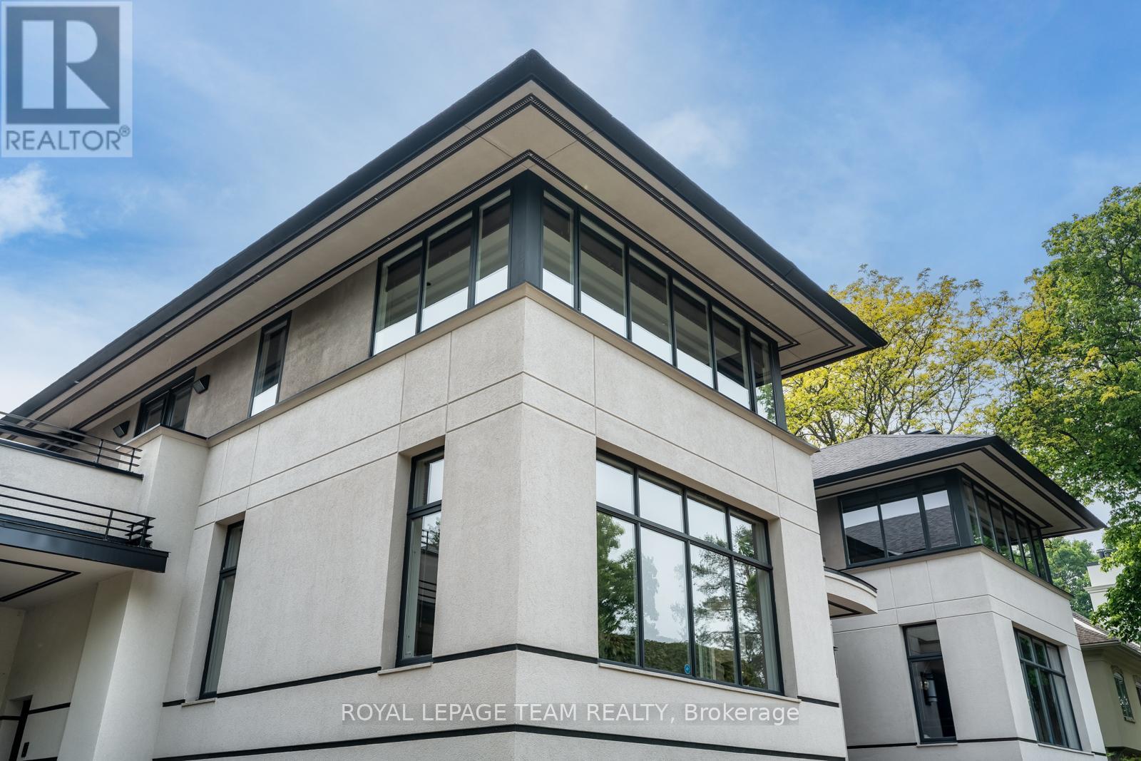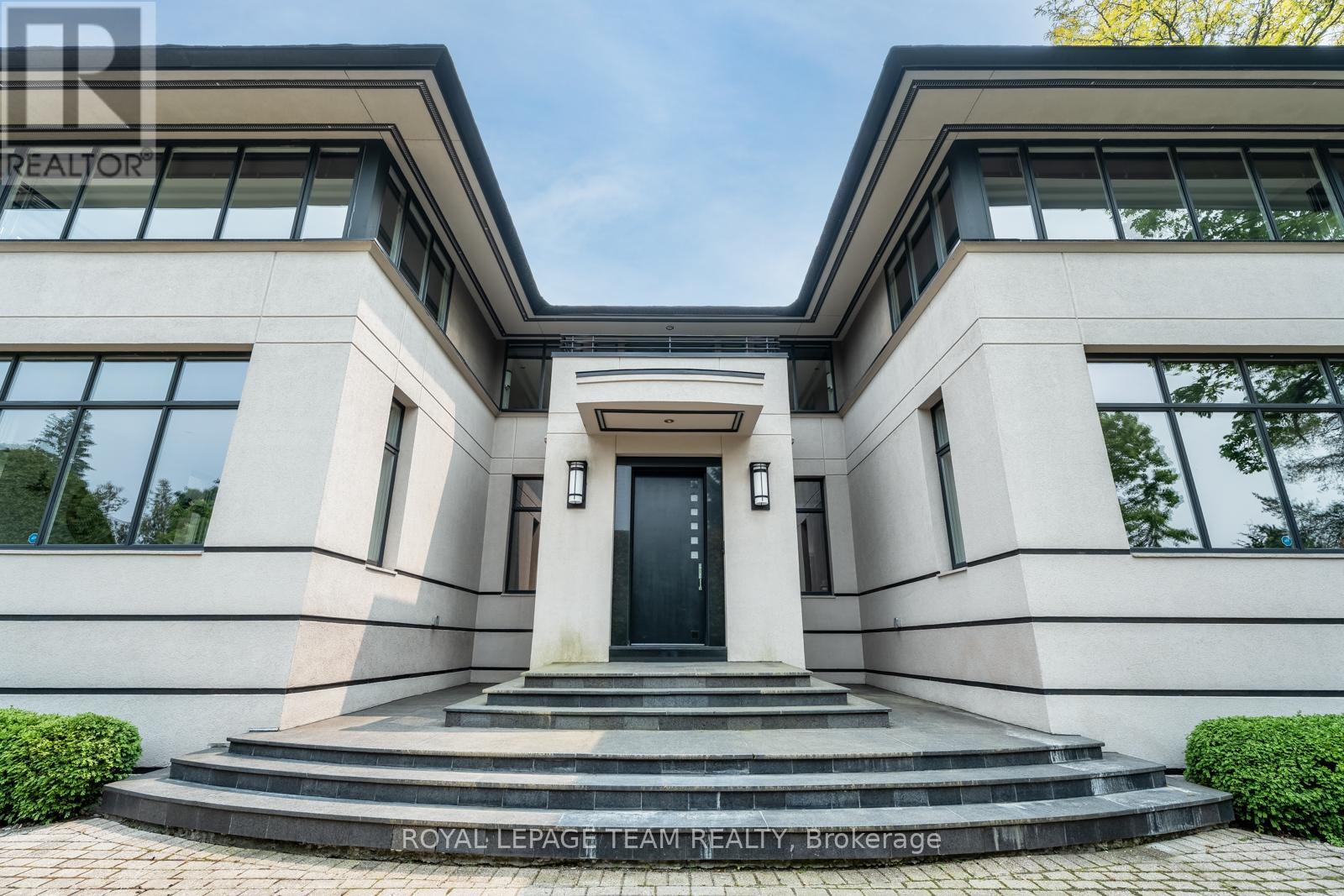 Sculptural. Rare. Uncompromising. In the private pocket where Rockcliffe Park began, this Barry Hobin designed contemporary is a vision of modern architecture. Clean horizontal lines, granite detailing, and vast glass surfaces define a bold exterior. Inside a soaring atrium anchors luminous living spaces, from the dramatic formal wing to the serene family quarters. Entertain in style with a showstopping dining room, refined living areas, and curated finishes. Sky lit family rooms, black granite fireplaces, custom millwork, and recessed baseboards elevate every detail. Upstairs, the expansive primary features dual spa-style baths; additional bedrooms stun with their own art deco baths; while private terraces offer sweeping views over the Apostolic Nunciature's majestic grounds. A vast lower offers space for studio, cinema, gym, or lounge. Outside, sculptural landscaping and a Japanese-inspired garden frame the front; the rear is ready for a bold poolscape or tranquil escape. Unmistakably singular in vision; decadent in experience. (id:49063)