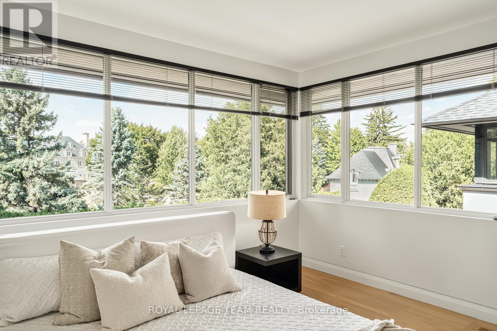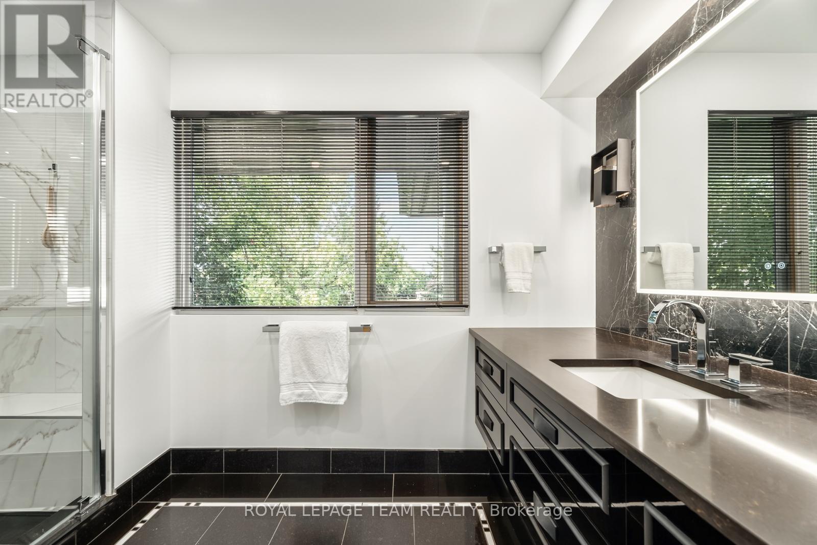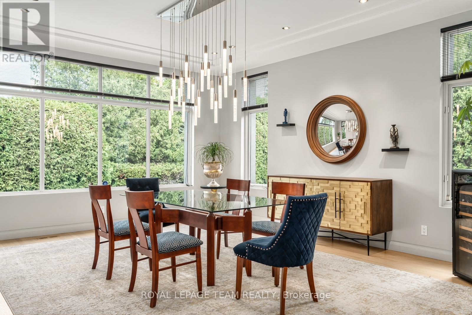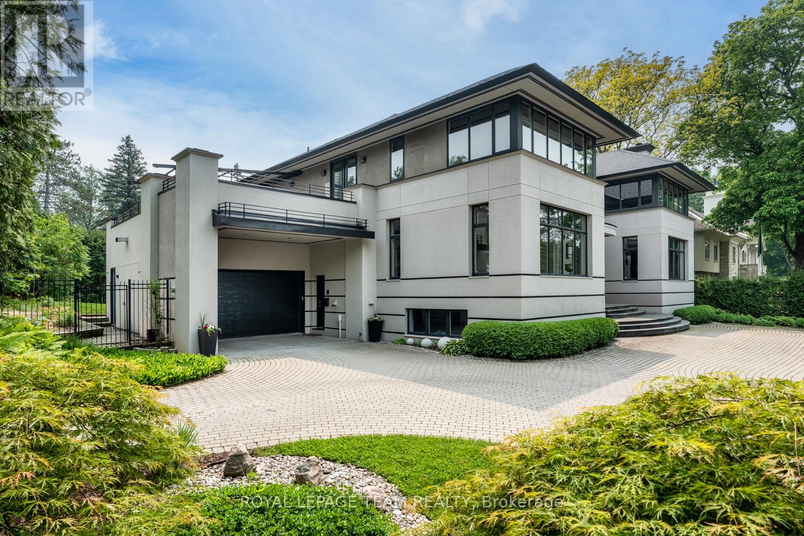 Sculptural. Rare. Uncompromising. In the private pocket where Rockcliffe Park began, this Barry Hobin designed contemporary is a vision of modern architecture. Clean horizontal lines, granite detailing, and vast glass surfaces define a bold exterior. Inside a soaring atrium anchors luminous living spaces, from the dramatic formal wing to the serene family quarters. Entertain in style with a showstopping dining room, refined living areas, and curated finishes. Sky lit family rooms, black granite fireplaces, custom millwork, and recessed baseboards elevate every detail. Upstairs, the expansive primary features dual spa-style baths; additional bedrooms stun with their own art deco baths; while private terraces offer sweeping views over the Apostolic Nunciature's majestic grounds. A vast lower offers space for studio, cinema, gym, or lounge. Outside, sculptural landscaping and a Japanese-inspired garden frame the front; the rear is ready for a bold poolscape or tranquil escape. Unmistakably singular in vision; decadent in experience. (id:49063)