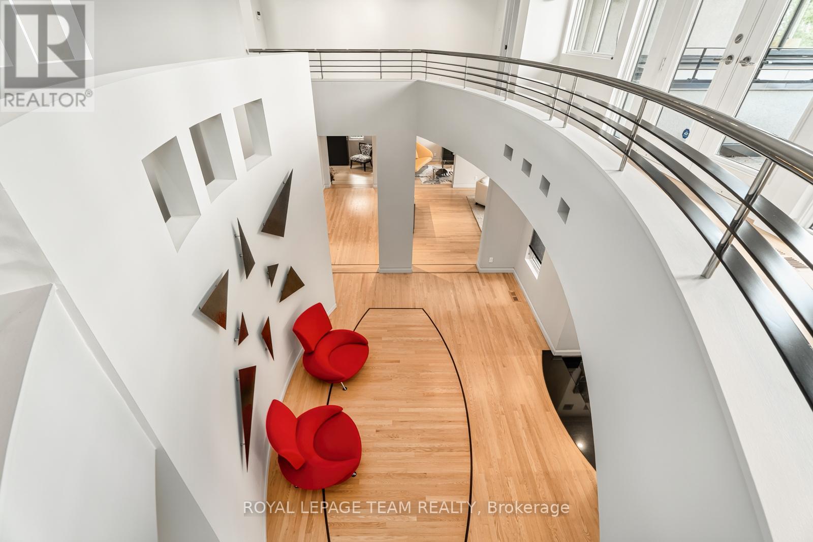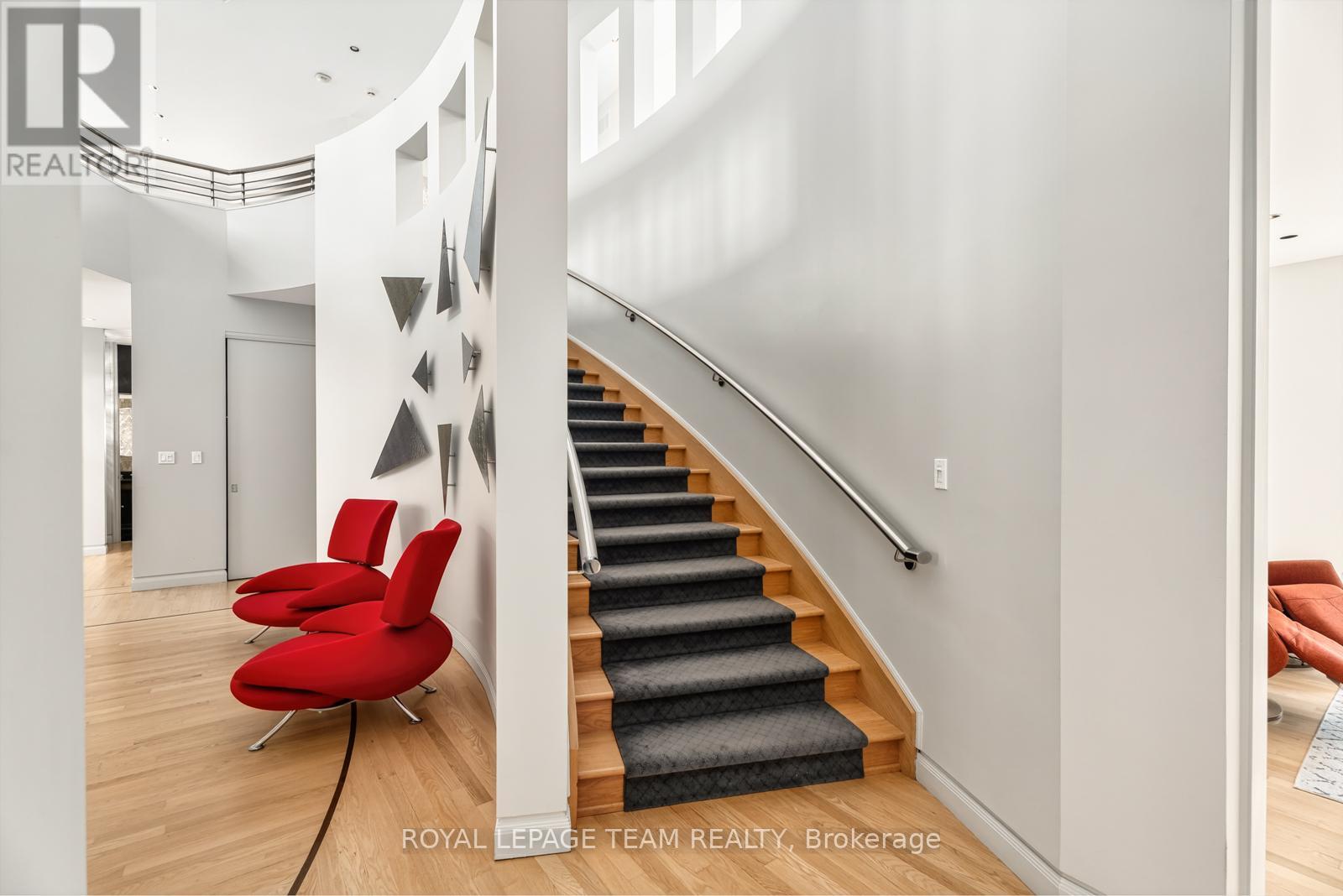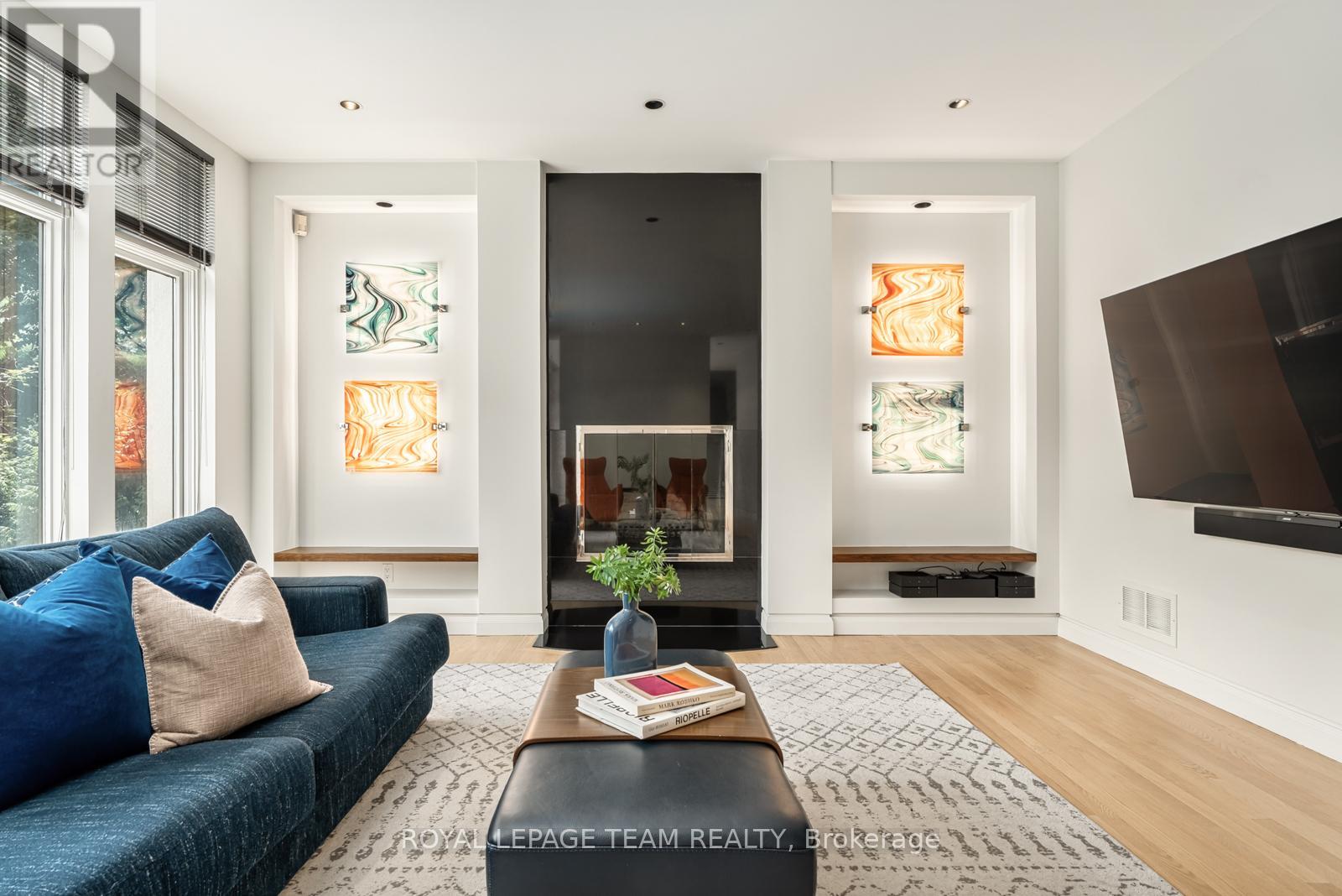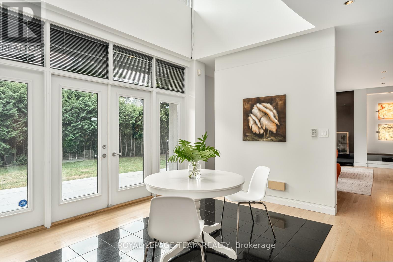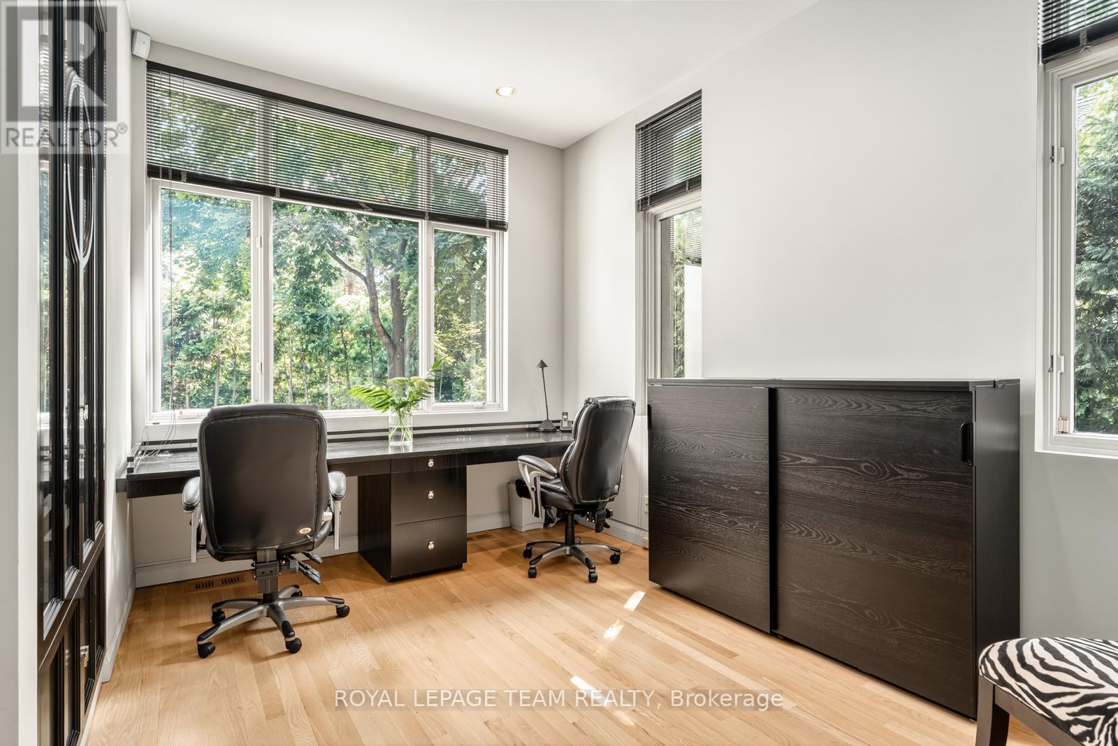 Sculptural. Rare. Uncompromising. In the private pocket where Rockcliffe Park began, this Barry Hobin designed contemporary is a vision of modern architecture. Clean horizontal lines, granite detailing, and vast glass surfaces define a bold exterior. Inside a soaring atrium anchors luminous living spaces, from the dramatic formal wing to the serene family quarters. Entertain in style with a showstopping dining room, refined living areas, and curated finishes. Sky lit family rooms, black granite fireplaces, custom millwork, and recessed baseboards elevate every detail. Upstairs, the expansive primary features dual spa-style baths; additional bedrooms stun with their own art deco baths; while private terraces offer sweeping views over the Apostolic Nunciature's majestic grounds. A vast lower offers space for studio, cinema, gym, or lounge. Outside, sculptural landscaping and a Japanese-inspired garden frame the front; the rear is ready for a bold poolscape or tranquil escape. Unmistakably singular in vision; decadent in experience. (id:49063)