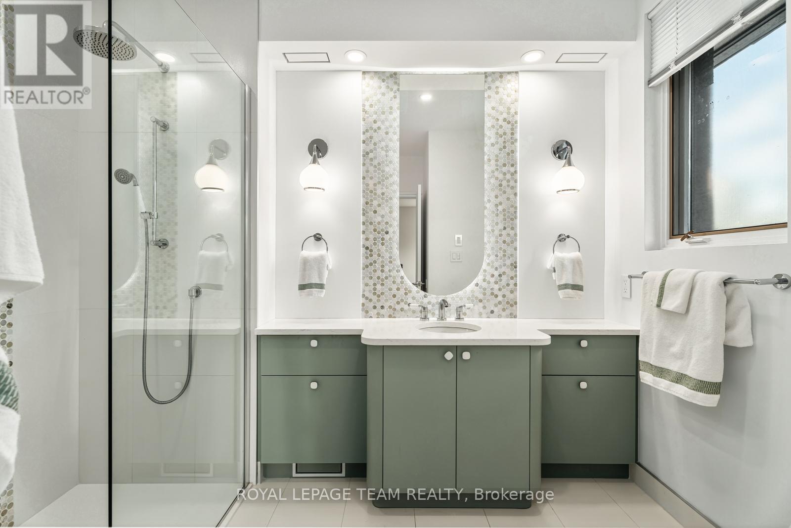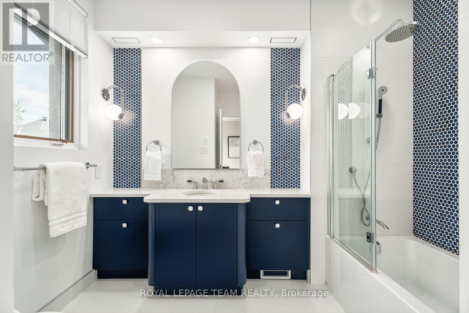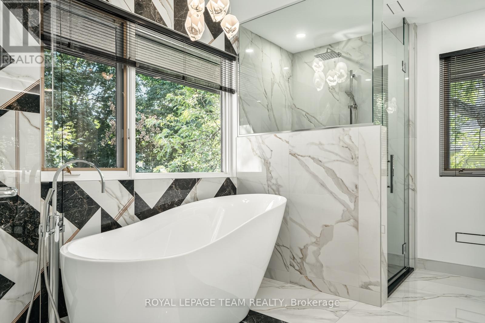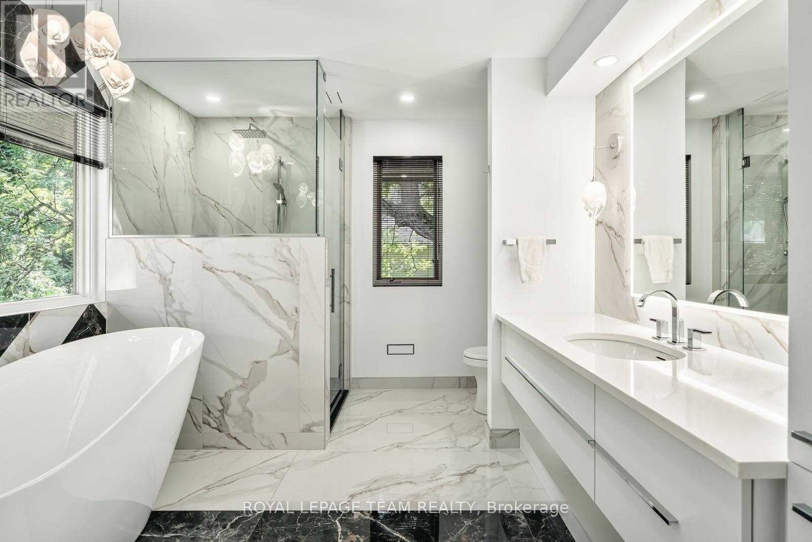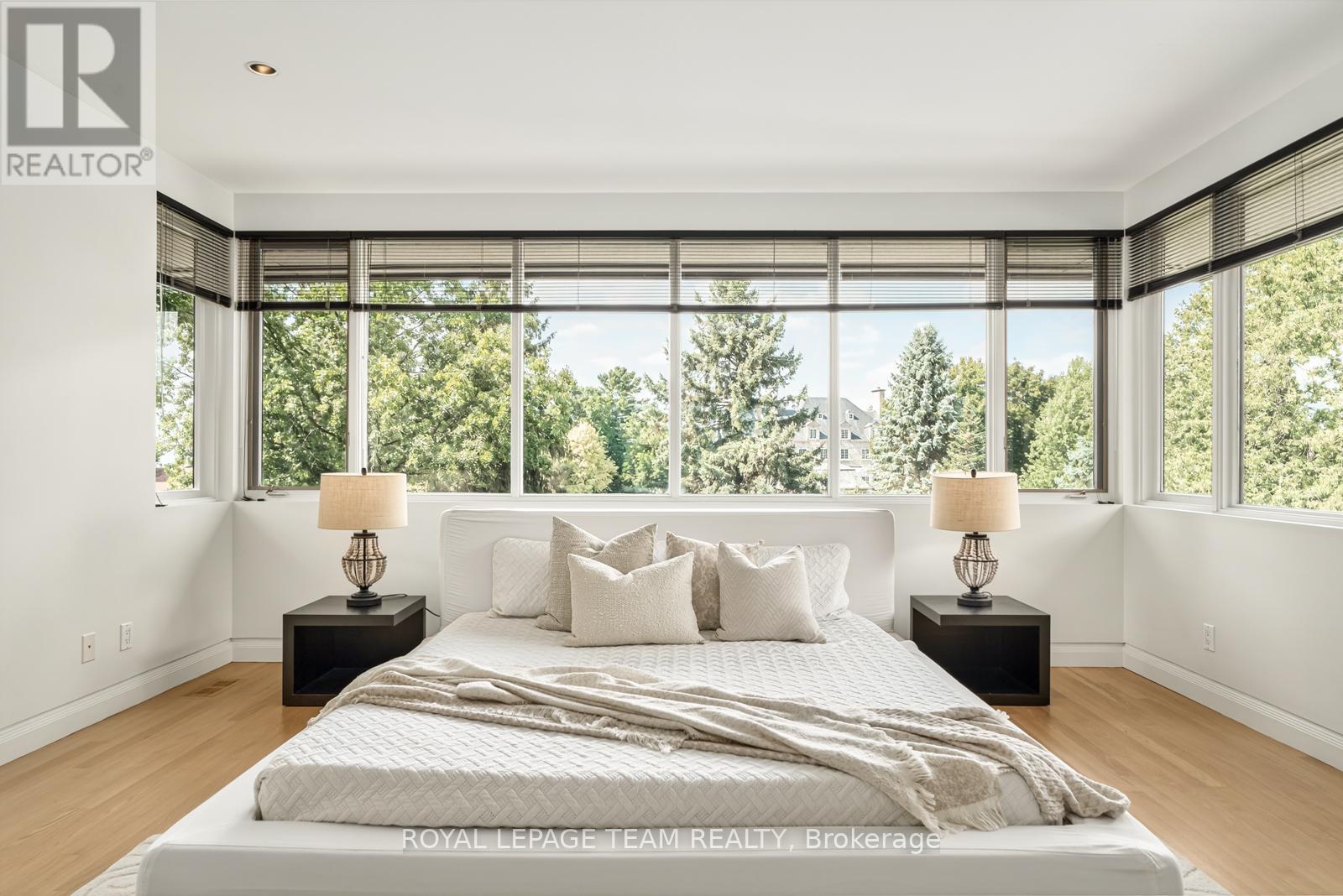Sculptural. Rare. Uncompromising. In the private pocket where Rockcliffe Park began, this Barry Hobin designed contemporary is a vision of modern architecture. Clean horizontal lines, granite detailing, and vast glass surfaces define a bold exterior. Inside a soaring atrium anchors luminous living spaces, from the dramatic formal wing to the serene family quarters. Entertain in style with a showstopping dining room, refined living areas, and curated finishes. Sky lit family rooms, black granite fireplaces, custom millwork, and recessed baseboards elevate every detail. Upstairs, the expansive primary features dual spa-style baths; additional bedrooms stun with their own art deco baths; while private terraces offer sweeping views over the Apostolic Nunciature's majestic grounds. A vast lower offers space for studio, cinema, gym, or lounge. Outside, sculptural landscaping and a Japanese-inspired garden frame the front; the rear is ready for a bold poolscape or tranquil escape. Unmistakably singular in vision; decadent in experience. (id:49063)