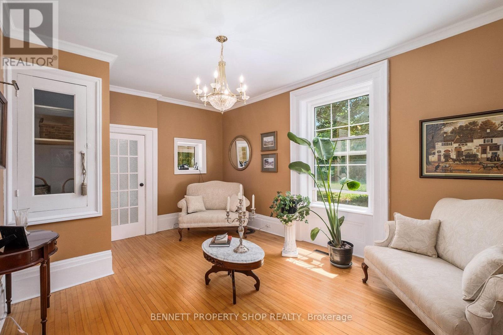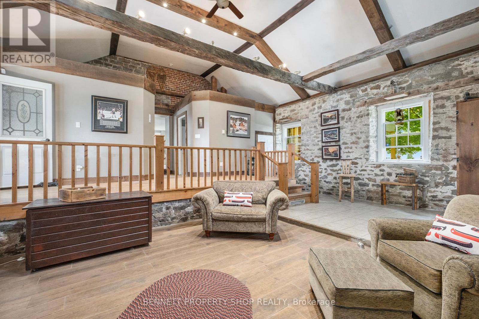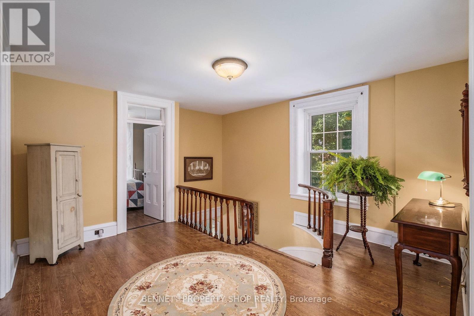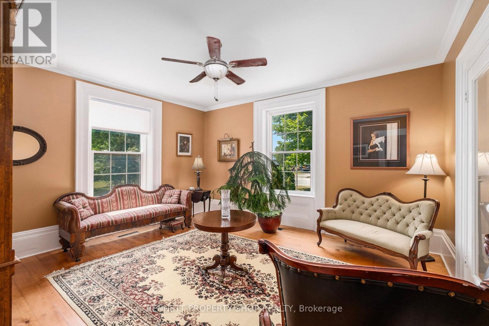 Step Back in Time, Embrace Modern Comfort: Your Historic Estate Awaits! Imagine owning a piece of history - a magnificent 1861 brick and stone residence where timeless elegance meets contemporary living. This legacy property, set on just under 2 acres and well back from the road, offers absolute tranquillity. Be captivated by soaring ceilings in the formal dining room, perfect for memorable gatherings. The formal parlour and front living room/library provide sophisticated spaces for relaxation, while the impressive two-story family room, crafted entirely from stone, offers a rugged yet refined retreat. At its heart, a Vermont Castings wood stove radiates warmth after a day outdoors. The expansive kitchen is a culinary dream, with a massive two-level island for workspace and casual dining, a full pantry, and a built-in desk. Step onto one of two decks to enjoy serene views over your pastoral lawn. Upstairs, four generous bedrooms and a dedicated office offer flexibility for family and work life, served by two full baths. Three distinct staircases hint at the homes rich history and thoughtful design. Outside, a substantial two-storey, three-bay garage offers exceptional storage for kayaks, bikes, tools, or a workshop, while an additional single-car garage adds convenience. This exceptional property is a rare opportunity to own a significant piece of history without sacrificing modern amenities or space. Embrace a lifestyle where the tranquillity of nature meets the sophistication of a meticulously maintained historic home. Book your private viewing today and envision your next chapter here. (id:49063)