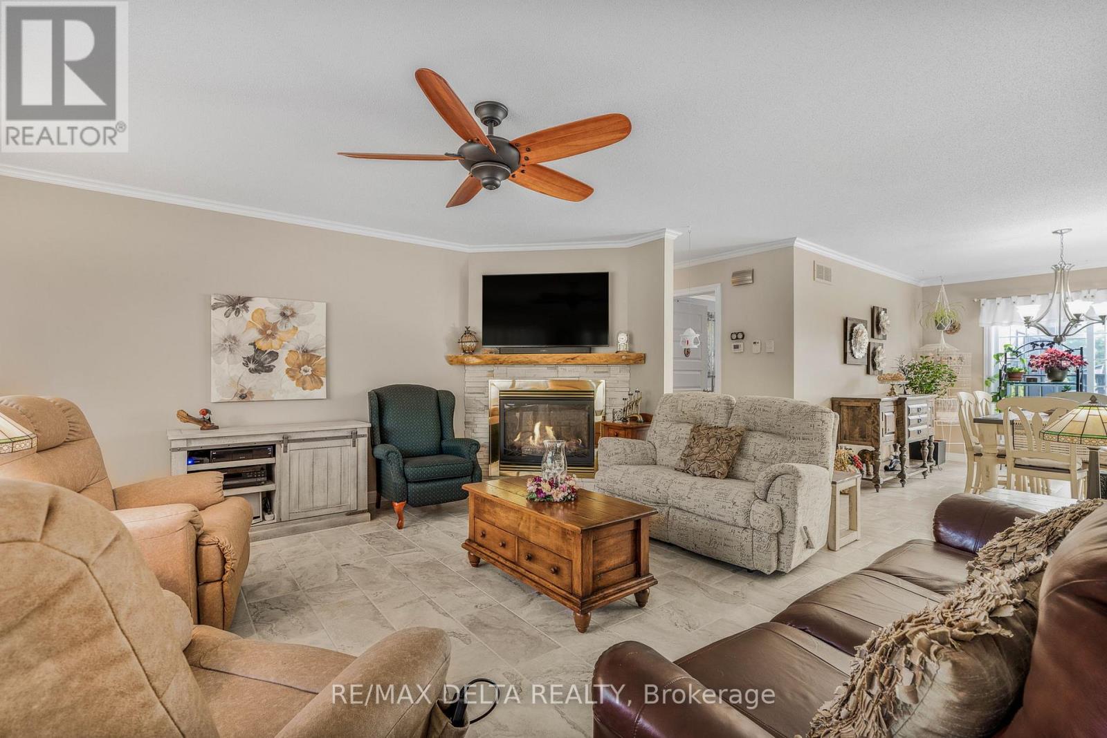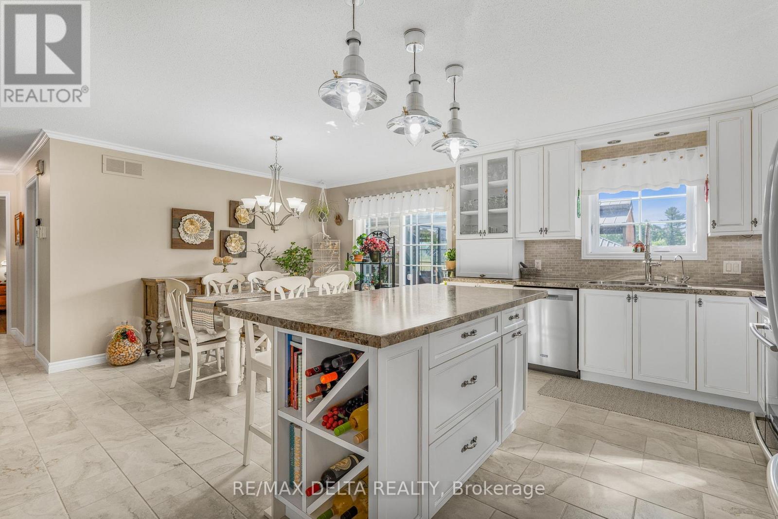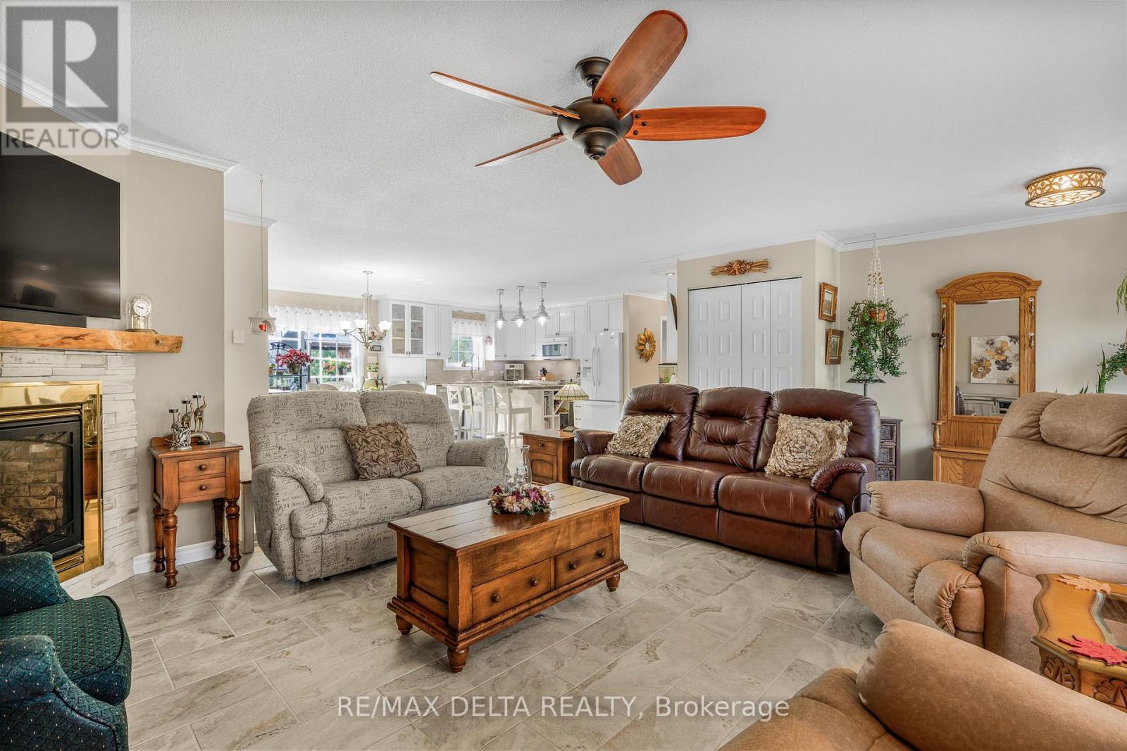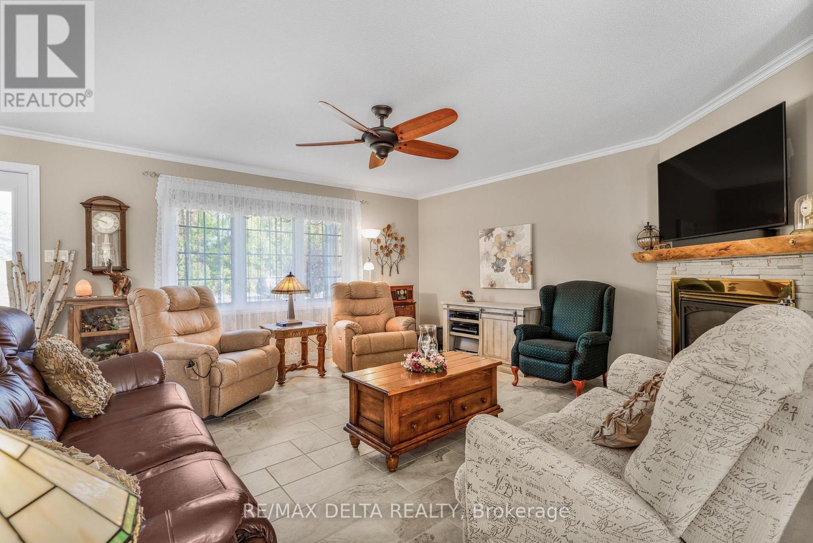 Welcome to your dream country retreat! This beautifully maintained bungalow offers the perfect balance of comfort, privacy, and spacious living both indoors and out. Set on 1.05 acres with no rear neighbours, this property is ideal for those seeking peace and quiet without sacrificing convenience. Inside, an open concept design creates a bright, airy flow. The inviting living room features a propane fireplace, elegant crown moulding, and large windows that flood the space with natural light. At the heart of the home, the kitchen boasts timeless white cabinetry, a large island with seating, and seamless connection to the dining area, perfect for family meals and entertaining. The main floor offers 2 comfortable bedrooms, including a generous primary suite complete with a spa-like ensuite featuring a clawfoot tub and double vanity. A second full bathroom and a convenient laundry room add to the functionality of this level. Downstairs, the fully finished basement nearly doubles your living space, offering a large family room, recreation area, an additional bedroom and abundant storage. Step outside to enjoy a paved driveway, attached insulated double garage, gazebo, two garden sheds, and a beautifully landscaped yard with plenty of space for entertaining or simply relaxing in nature. A charming creek runs through the property, connecting to the river and offering the perfect spot to launch a kayak or paddle board for peaceful days on the water. Additional features include a central vacuum system, air exchanger, water treatment system, and a large workshop area, perfect for hobbyists or DIY enthusiasts. This home is truly move-in ready and offers a rare opportunity to enjoy serene country living. (id:49063)