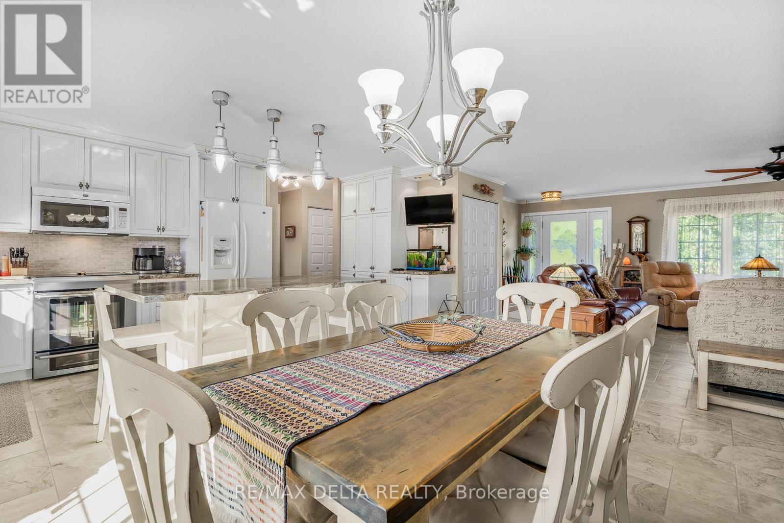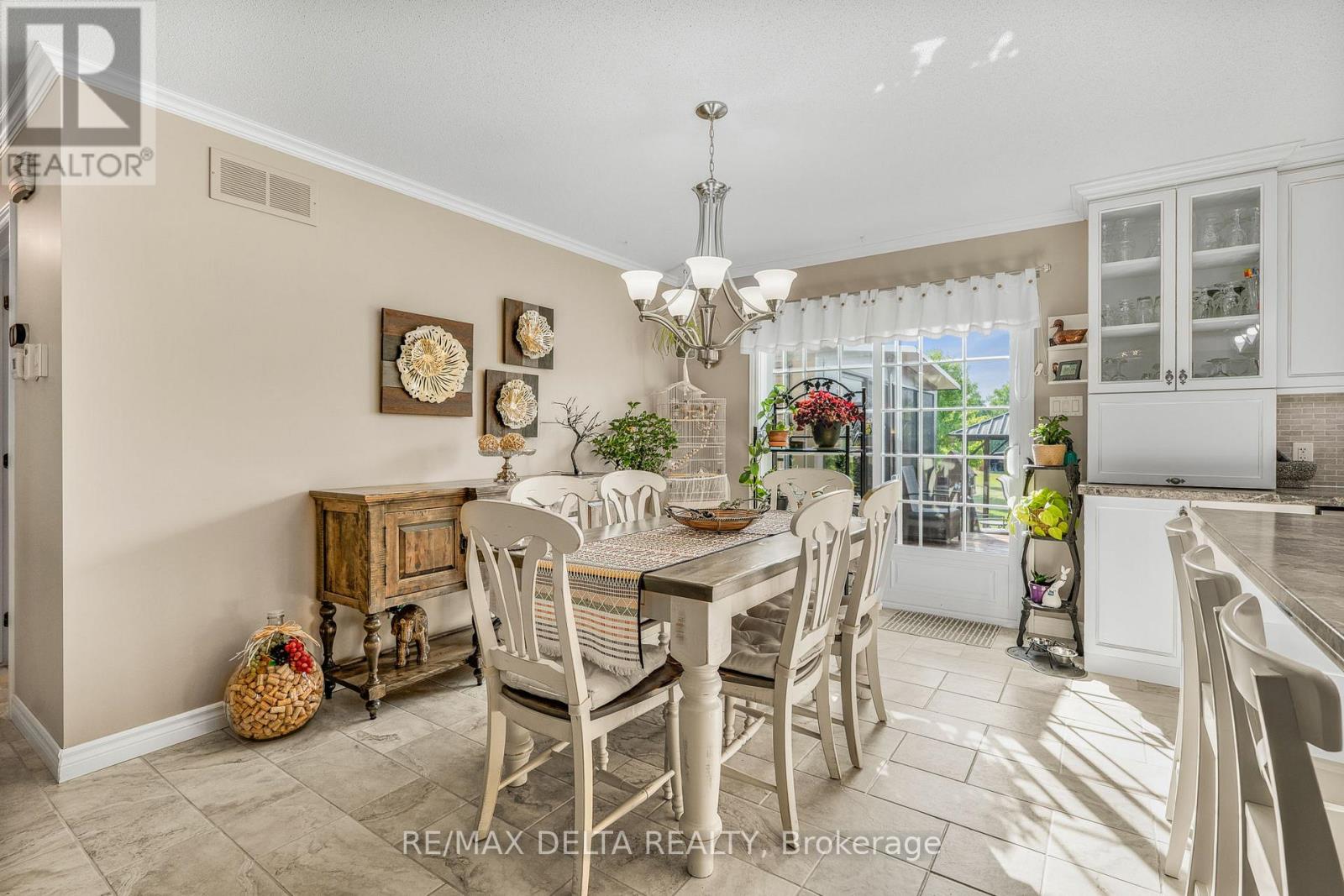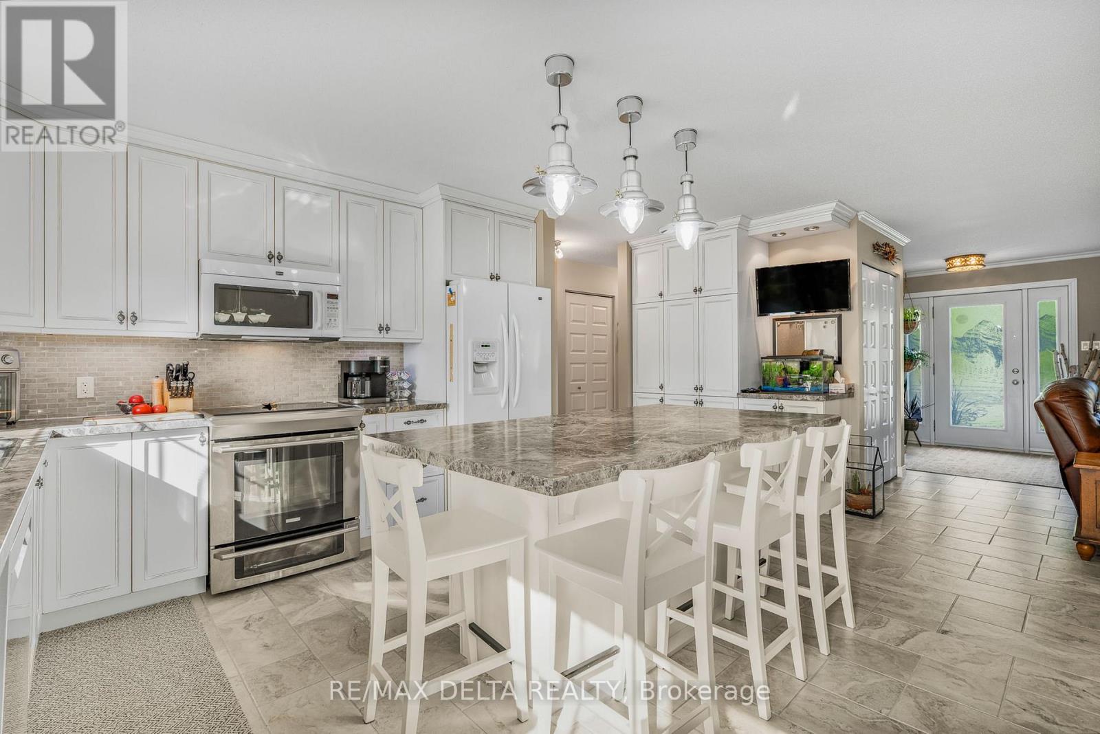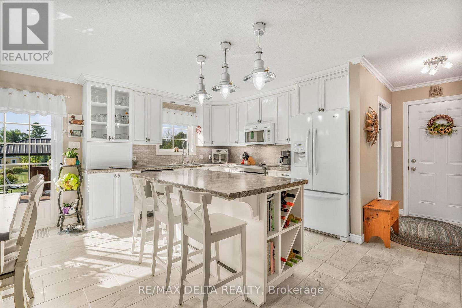 Welcome to your dream country retreat! This beautifully maintained bungalow offers the perfect balance of comfort, privacy, and spacious living both indoors and out. Set on 1.05 acres with no rear neighbours, this property is ideal for those seeking peace and quiet without sacrificing convenience. Inside, an open concept design creates a bright, airy flow. The inviting living room features a propane fireplace, elegant crown moulding, and large windows that flood the space with natural light. At the heart of the home, the kitchen boasts timeless white cabinetry, a large island with seating, and seamless connection to the dining area, perfect for family meals and entertaining. The main floor offers 2 comfortable bedrooms, including a generous primary suite complete with a spa-like ensuite featuring a clawfoot tub and double vanity. A second full bathroom and a convenient laundry room add to the functionality of this level. Downstairs, the fully finished basement nearly doubles your living space, offering a large family room, recreation area, an additional bedroom and abundant storage. Step outside to enjoy a paved driveway, attached insulated double garage, gazebo, two garden sheds, and a beautifully landscaped yard with plenty of space for entertaining or simply relaxing in nature. A charming creek runs through the property, connecting to the river and offering the perfect spot to launch a kayak or paddle board for peaceful days on the water. Additional features include a central vacuum system, air exchanger, water treatment system, and a large workshop area, perfect for hobbyists or DIY enthusiasts. This home is truly move-in ready and offers a rare opportunity to enjoy serene country living. (id:49063)