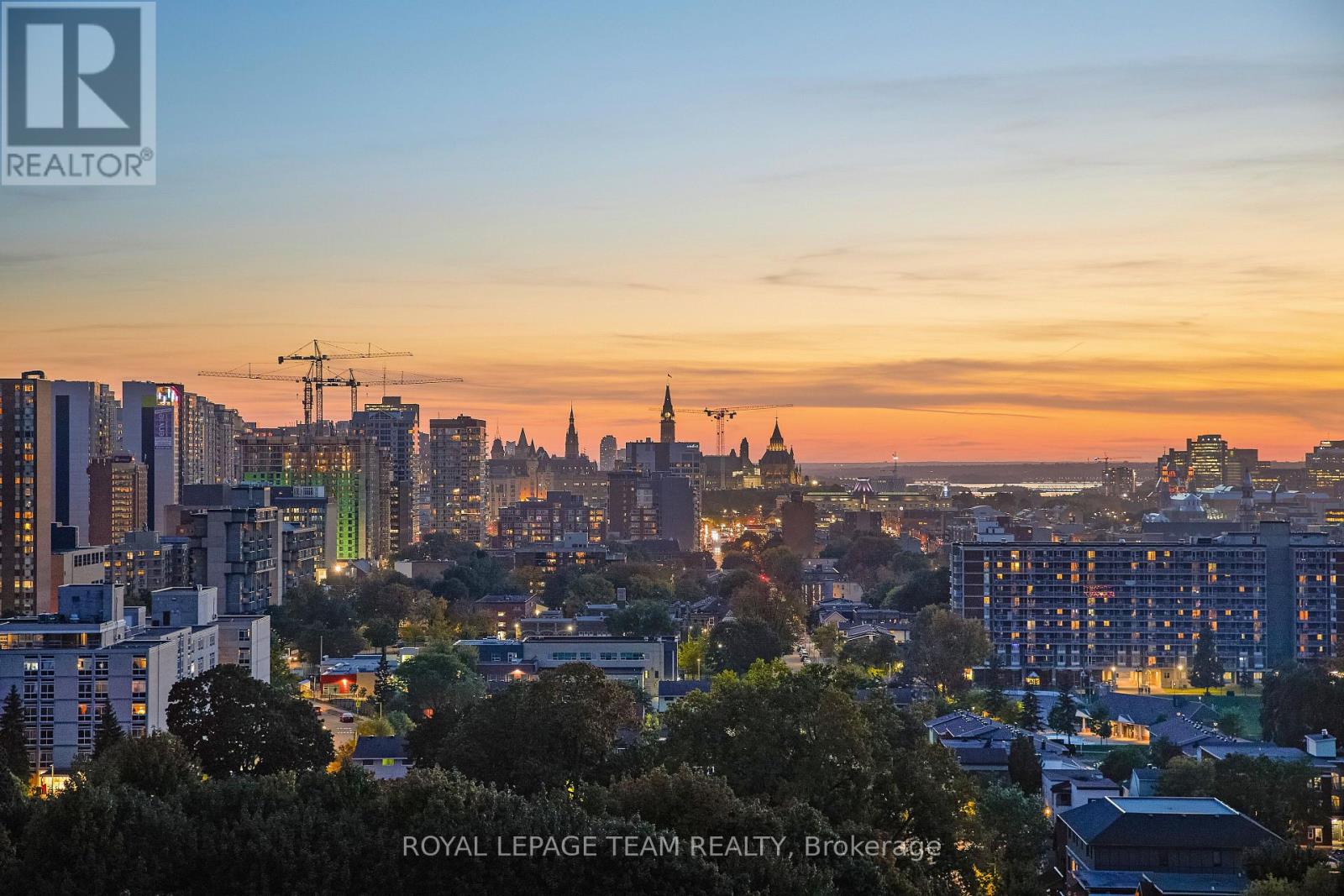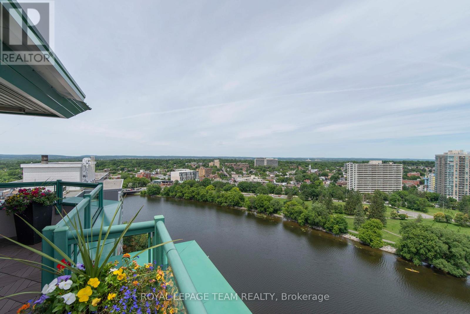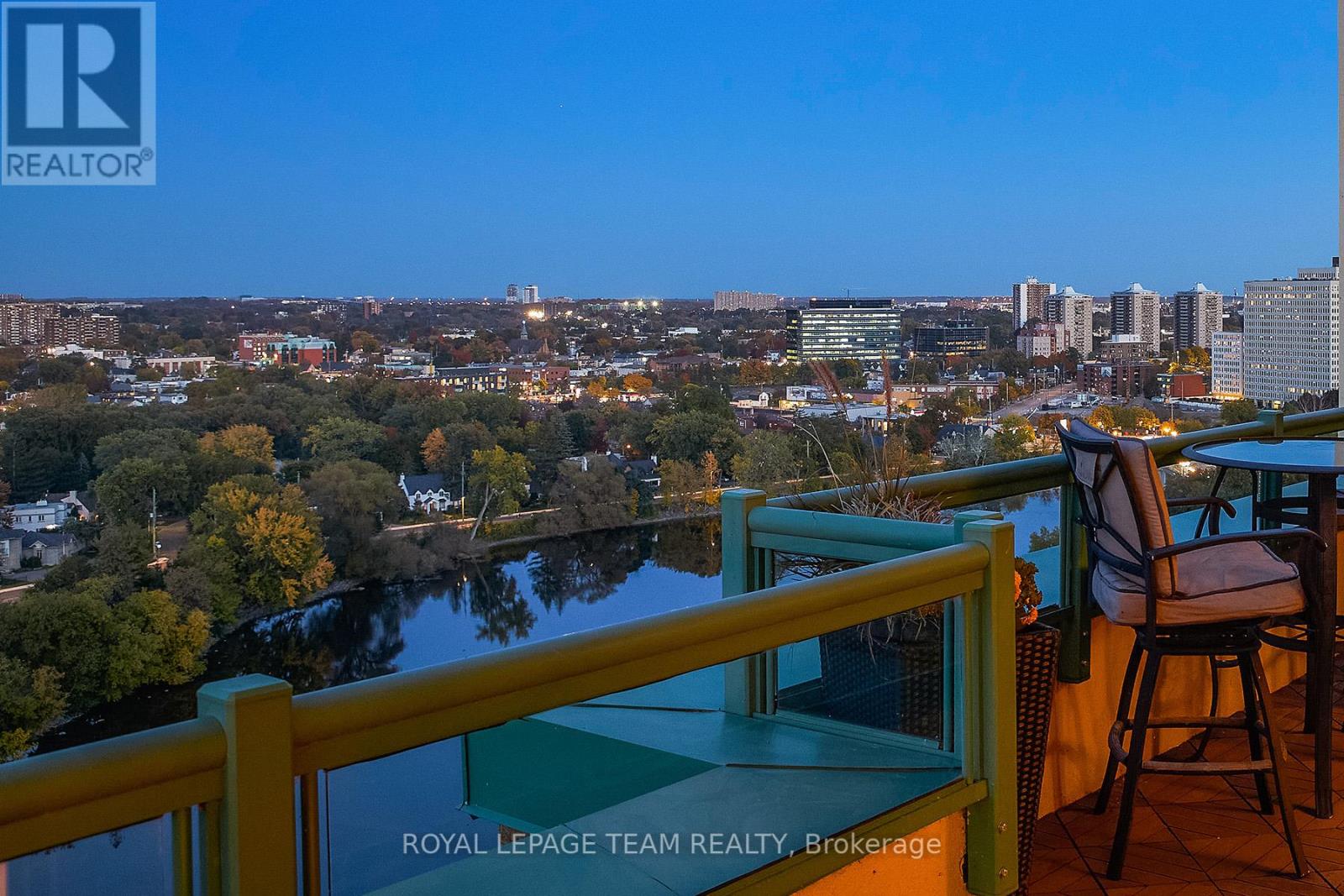 Your next move: inspired riverbank living in a top-of-the-world penthouse residence, where peace, refinement, and sophistication take priority the moment you step inside. From the first glance, you're welcomed by breathtaking 270+degree views that capture the best of Ottawa's beauty and Parliament Hills iconic silhouette, the dynamic city skyline, the shimmering Ottawa River, and the vibrant Gatineau Hills beyond. Whether you're entertaining guests, enjoying quiet mornings, or relaxing at days end, this ever-changing backdrop ensures you'll never tire of the scenery. Inside, a thoughtfully designed open-concept living, dining, and kitchen area sets the stage for stylish living. Maple hardwood flooring, rich cabinetry, high ceilings, recessed lighting, and custom built-ins combine to create an elegant yet comfortable space. A long hall designed as the perfect place to showcase your cherished art pieces, bringing a sense of gallery-like sophistication to daily life. Two spacious bedrooms offer privacy and autonomy, each with its own ensuite bath and generous closet space to ensure complete comfort. The primary suite enjoys its own private terrace, an exclusive retreat with unmatched views. Additional conveniences include a den or home office, in-unit laundry, study, and easy hallway access to all spaces. An expansive balcony invites you to unwind or host gatherings against the dramatic backdrop of the Gatineau Hills, with summer fireworks providing spectacular entertainment. Outdoor enthusiasts will appreciate proximity to Macdonald Gardens Park, riverfront trails, and bike paths. Business and cultural centres are just minutes away, catering to a vibrant urban lifestyle. With two parking spaces, visitor parking, and ample storage, comings and goings are effortless. Seize this rare opportunity for penthouse living at its finest where breathtaking views, inspired design, and unparalleled convenience await. (id:49063)