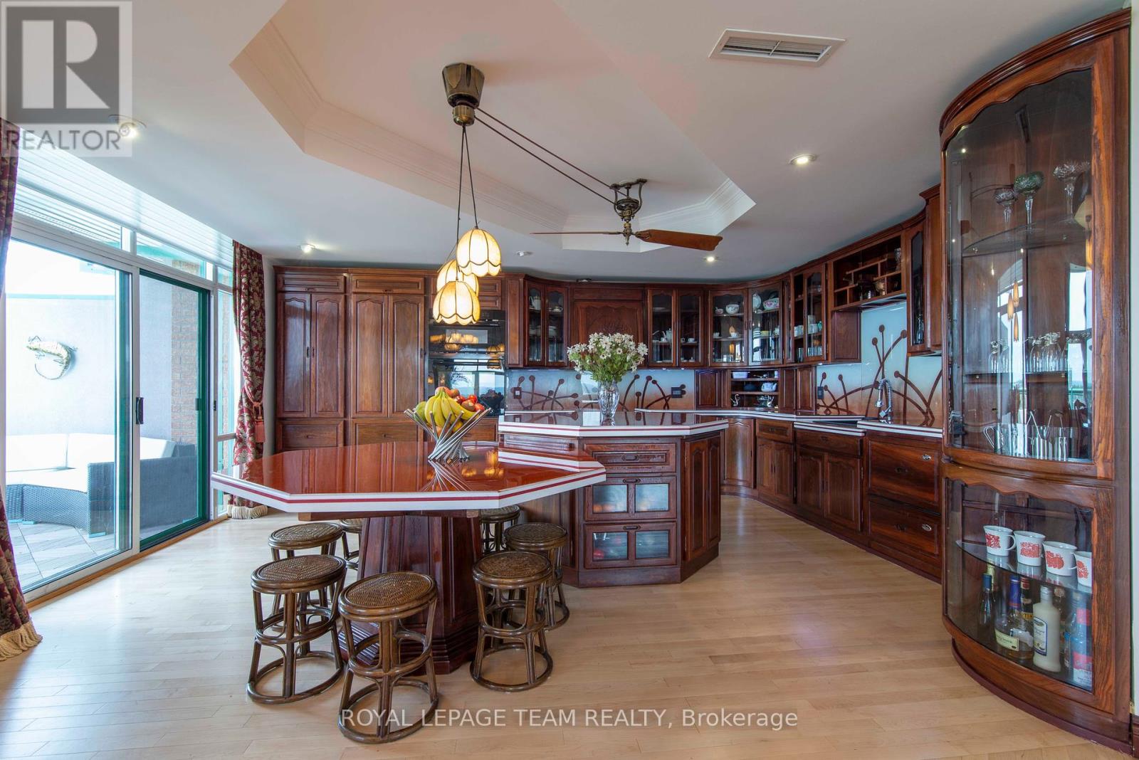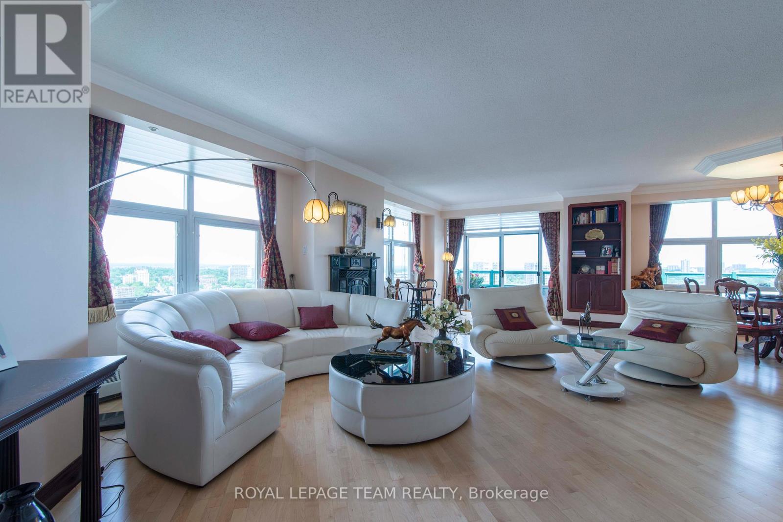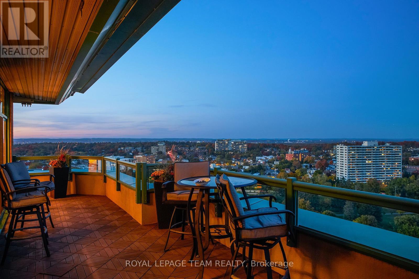 Your next move: inspired riverbank living in a top-of-the-world penthouse residence, where peace, refinement, and sophistication take priority the moment you step inside. From the first glance, you're welcomed by breathtaking 270+degree views that capture the best of Ottawa's beauty and Parliament Hills iconic silhouette, the dynamic city skyline, the shimmering Ottawa River, and the vibrant Gatineau Hills beyond. Whether you're entertaining guests, enjoying quiet mornings, or relaxing at days end, this ever-changing backdrop ensures you'll never tire of the scenery. Inside, a thoughtfully designed open-concept living, dining, and kitchen area sets the stage for stylish living. Maple hardwood flooring, rich cabinetry, high ceilings, recessed lighting, and custom built-ins combine to create an elegant yet comfortable space. A long hall designed as the perfect place to showcase your cherished art pieces, bringing a sense of gallery-like sophistication to daily life. Two spacious bedrooms offer privacy and autonomy, each with its own ensuite bath and generous closet space to ensure complete comfort. The primary suite enjoys its own private terrace, an exclusive retreat with unmatched views. Additional conveniences include a den or home office, in-unit laundry, study, and easy hallway access to all spaces. An expansive balcony invites you to unwind or host gatherings against the dramatic backdrop of the Gatineau Hills, with summer fireworks providing spectacular entertainment. Outdoor enthusiasts will appreciate proximity to Macdonald Gardens Park, riverfront trails, and bike paths. Business and cultural centres are just minutes away, catering to a vibrant urban lifestyle. With two parking spaces, visitor parking, and ample storage, comings and goings are effortless. Seize this rare opportunity for penthouse living at its finest where breathtaking views, inspired design, and unparalleled convenience await. (id:49063)