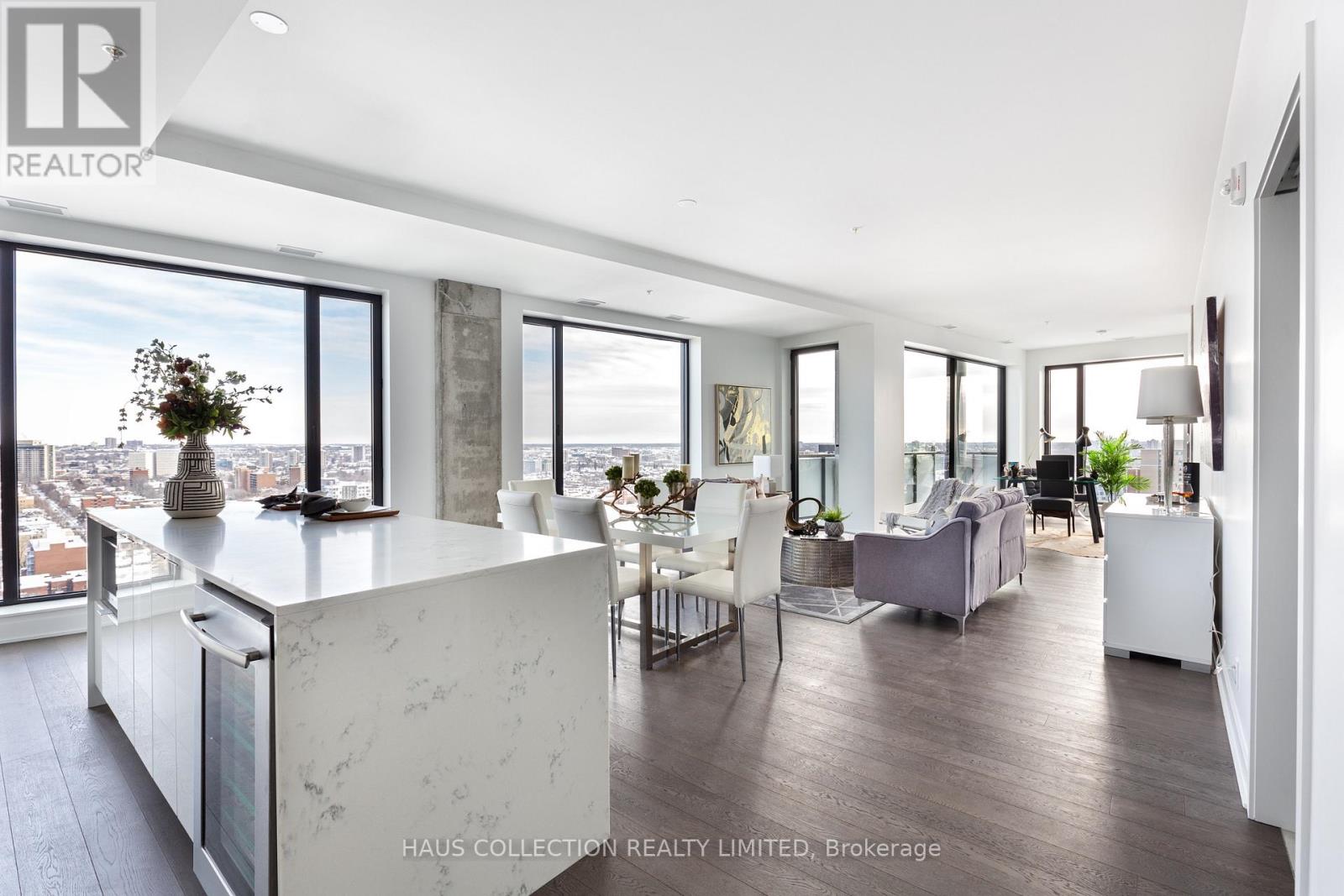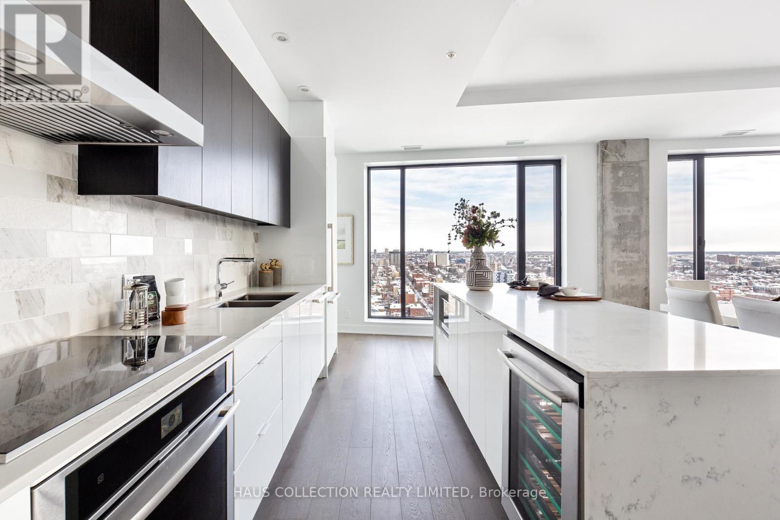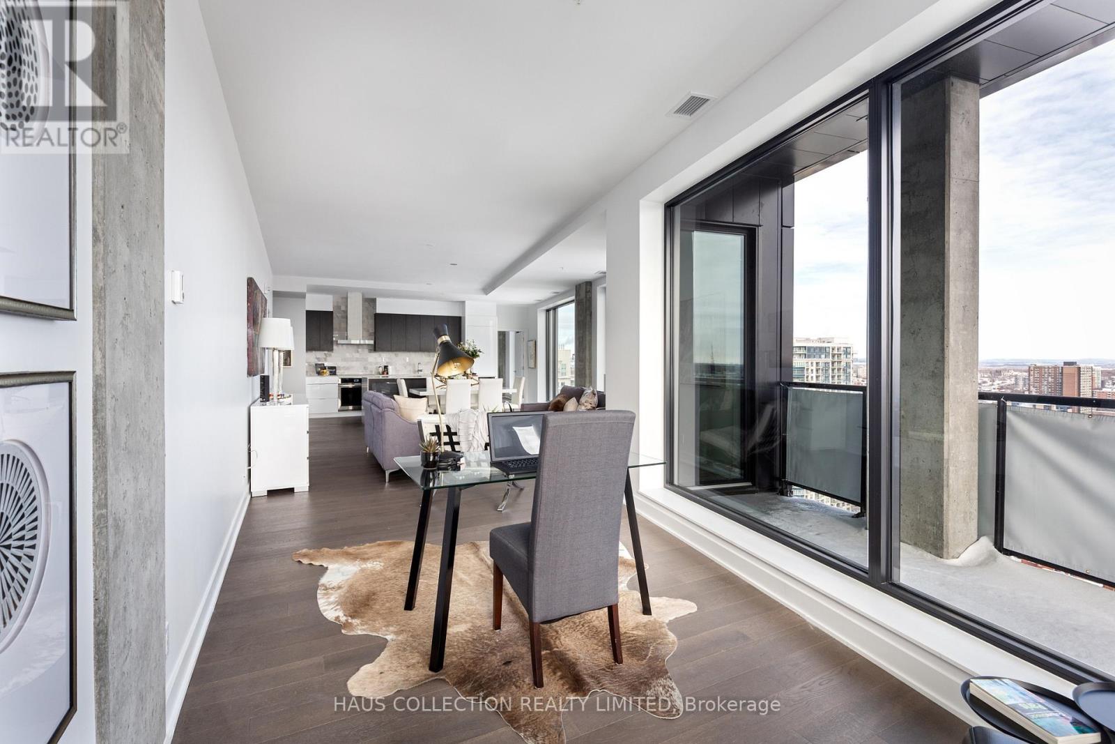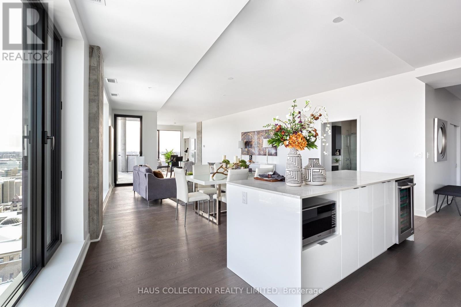 Penthouse 2305 at ArtHaus is a rare offering that elevates downtown living in every sense. This 2-bedroom, 2-bathroom corner suite boasts soaring 10-foot smooth ceilings, expansive portrait windows with sweeping views to the east and south of Ottawa, and a covered balcony for quiet outdoor moments. Inside, you'll find premium upgrades throughout: oak hardwood floors, custom window sheers, remote-controlled blackout curtains in both bedrooms, and a generous foyer with built-in storage. The kitchen is a showpiece featuring integrated JennAir appliances (including built-in fridge and wine cooler), quartz waterfall island, designer light fixtures, and exceptional storage. The open-concept layout flows seamlessly into the living and dining areas, bathed in natural light. The primary bedroom includes a walk-in closet with custom cabinetry and an elegant ensuite with rainfall shower and wand. A full-size washer/dryer and a second bathroom with tub complete this sophisticated residence. ArtHaus is an intimate, boutique residence with only 87 suites. On this exclusive penthouse floor, you're one of just four residences offering unmatched privacy in the heart of downtown. Residents enjoy a private lobby, fitness studio, rooftop terrace with fireplace and BBQs, resident lounge, and is uniquely situated atop the Ottawa Art Gallery and Le Germain Hotel, offering effortless access to downtown Ottawa's cultural and culinary amenities. A truly unique and elevated living experience awaits. Photos shown are of the unit when previously staged. (id:49063)