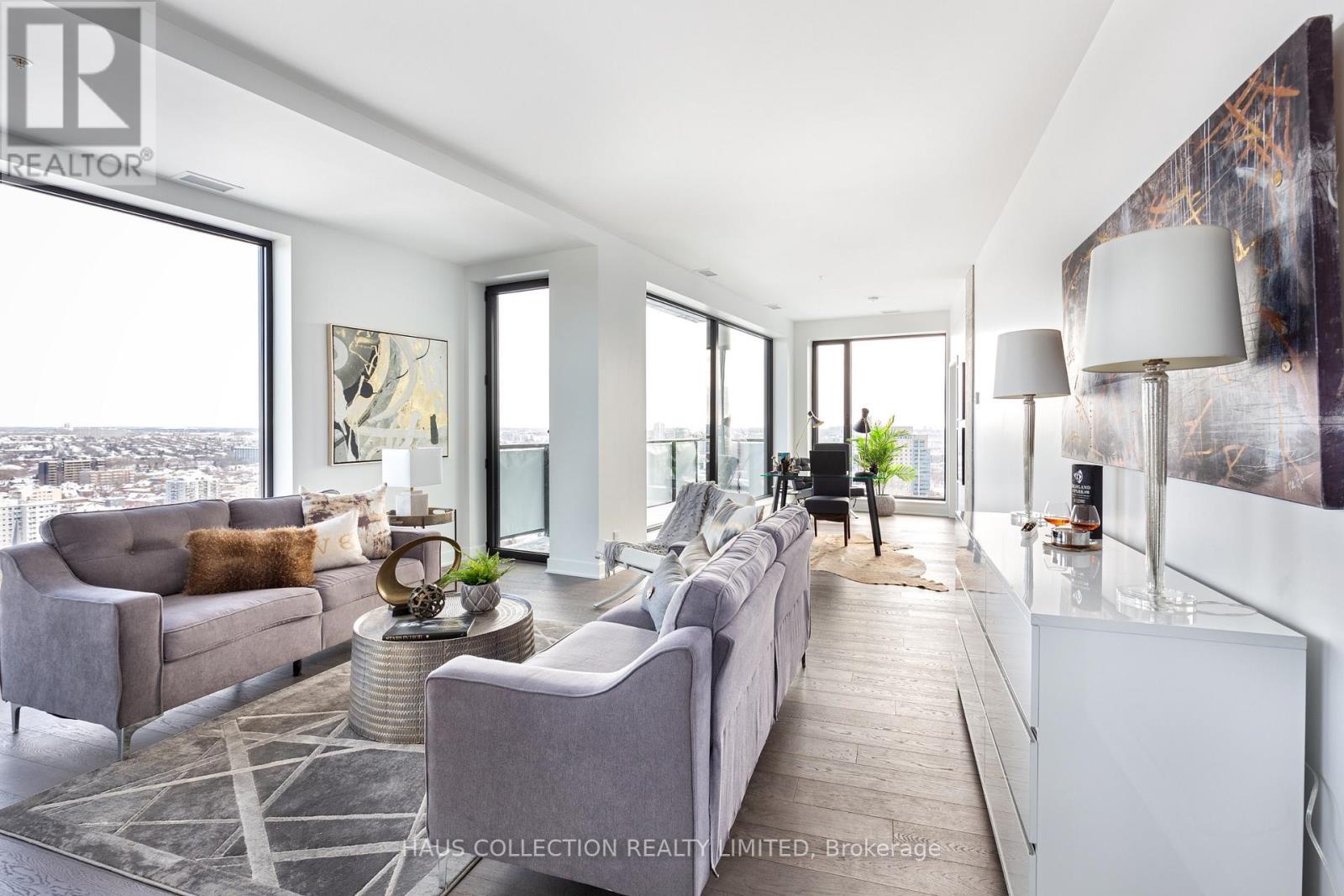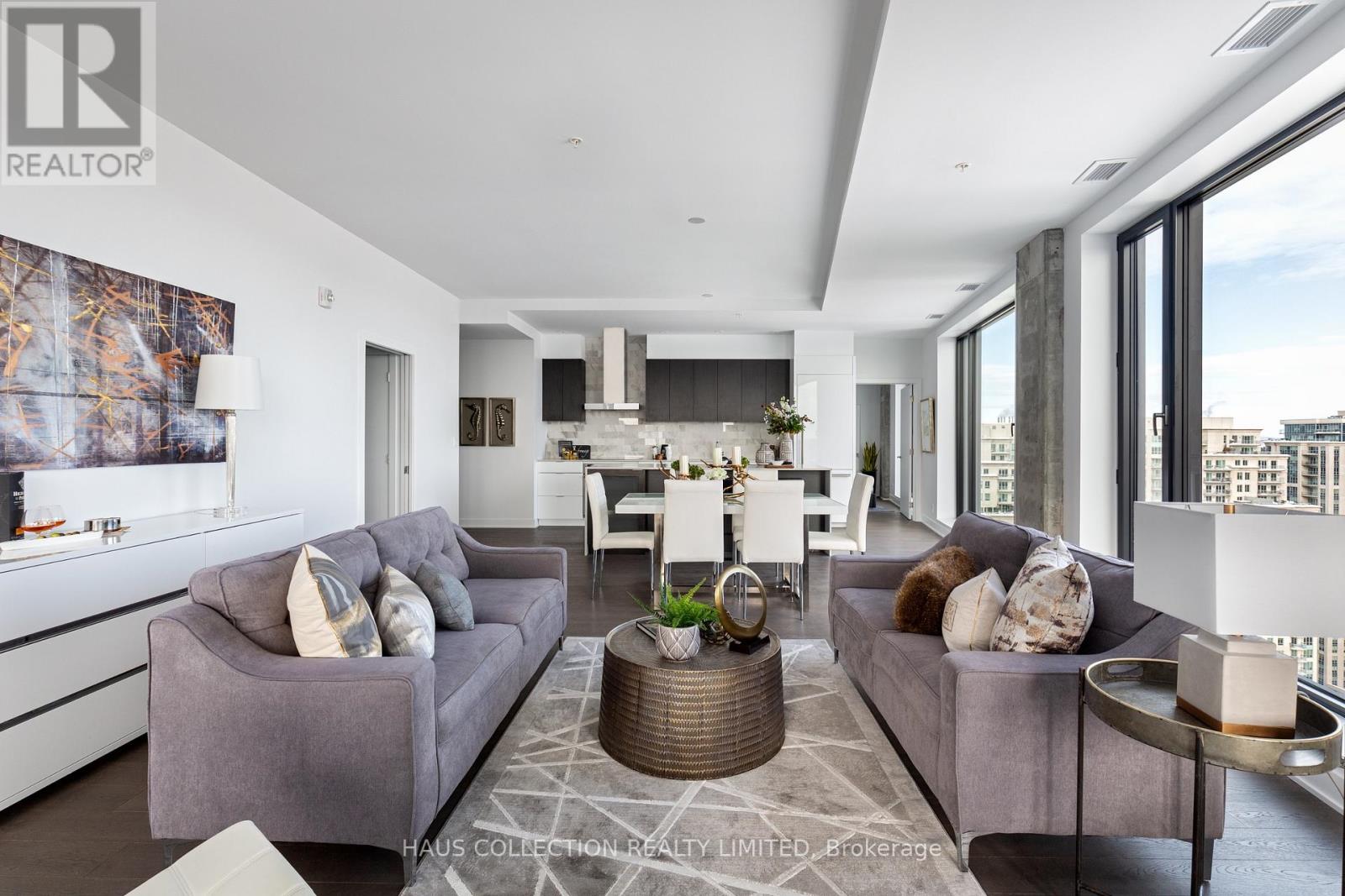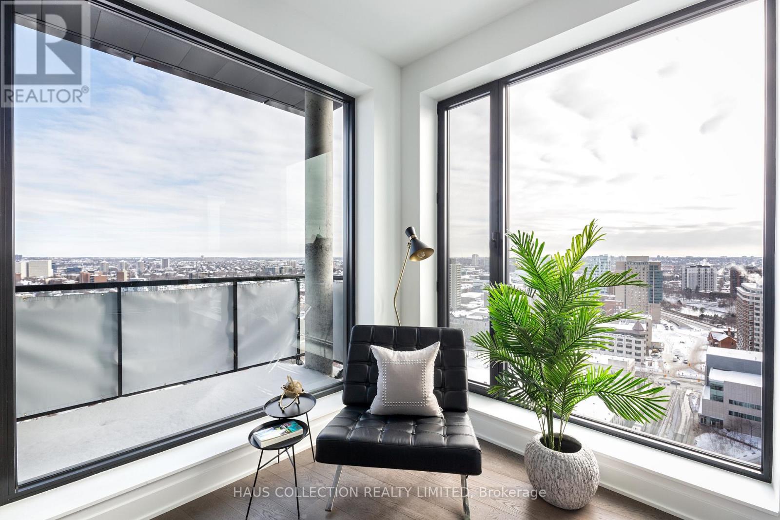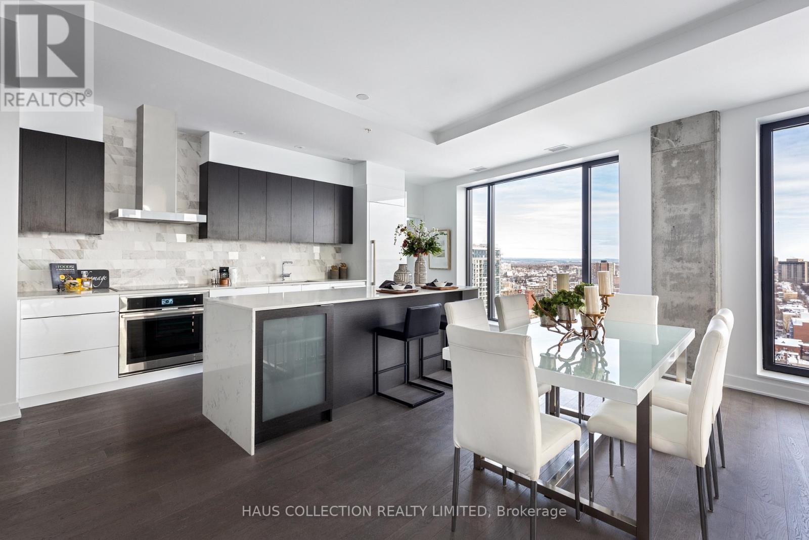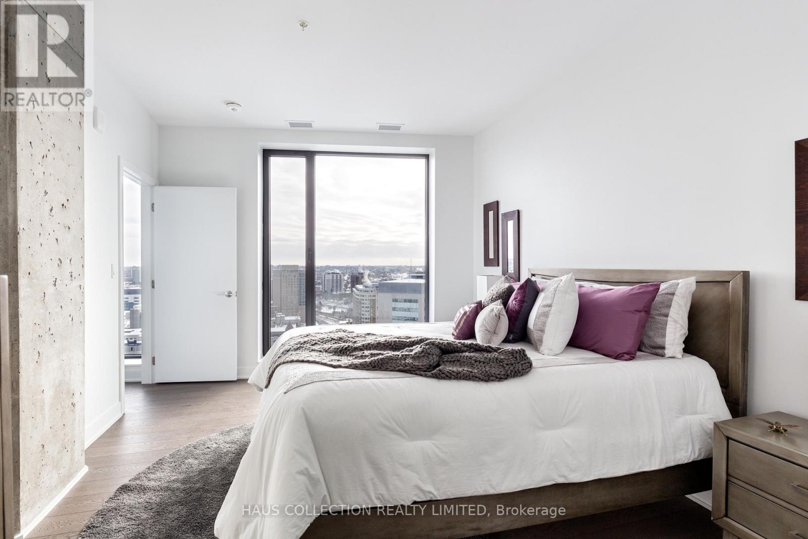 Penthouse 2305 at ArtHaus is a rare offering that elevates downtown living in every sense. This 2-bedroom, 2-bathroom corner suite boasts soaring 10-foot smooth ceilings, expansive portrait windows with sweeping views to the east and south of Ottawa, and a covered balcony for quiet outdoor moments. Inside, you'll find premium upgrades throughout: oak hardwood floors, custom window sheers, remote-controlled blackout curtains in both bedrooms, and a generous foyer with built-in storage. The kitchen is a showpiece featuring integrated JennAir appliances (including built-in fridge and wine cooler), quartz waterfall island, designer light fixtures, and exceptional storage. The open-concept layout flows seamlessly into the living and dining areas, bathed in natural light. The primary bedroom includes a walk-in closet with custom cabinetry and an elegant ensuite with rainfall shower and wand. A full-size washer/dryer and a second bathroom with tub complete this sophisticated residence. ArtHaus is an intimate, boutique residence with only 87 suites. On this exclusive penthouse floor, you're one of just four residences offering unmatched privacy in the heart of downtown. Residents enjoy a private lobby, fitness studio, rooftop terrace with fireplace and BBQs, resident lounge, and is uniquely situated atop the Ottawa Art Gallery and Le Germain Hotel, offering effortless access to downtown Ottawa's cultural and culinary amenities. A truly unique and elevated living experience awaits. Photos shown are of the unit when previously staged. (id:49063)