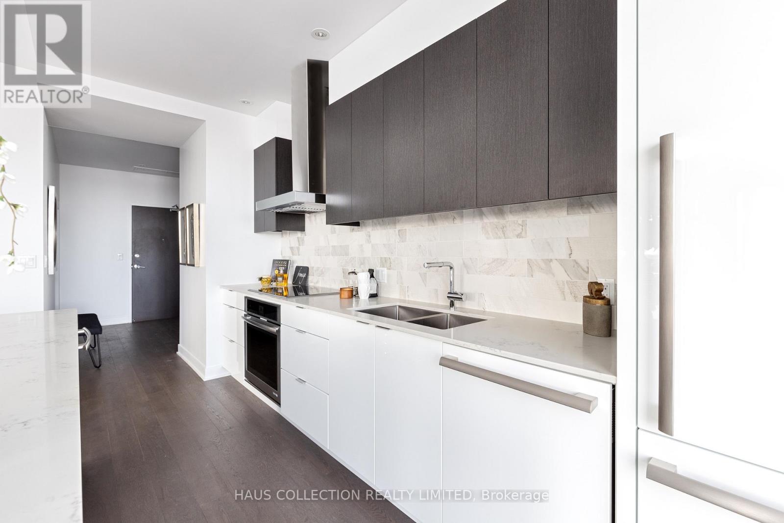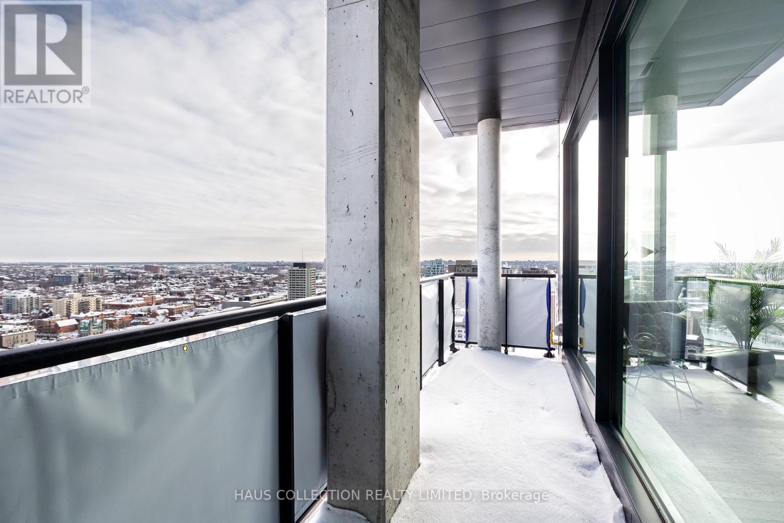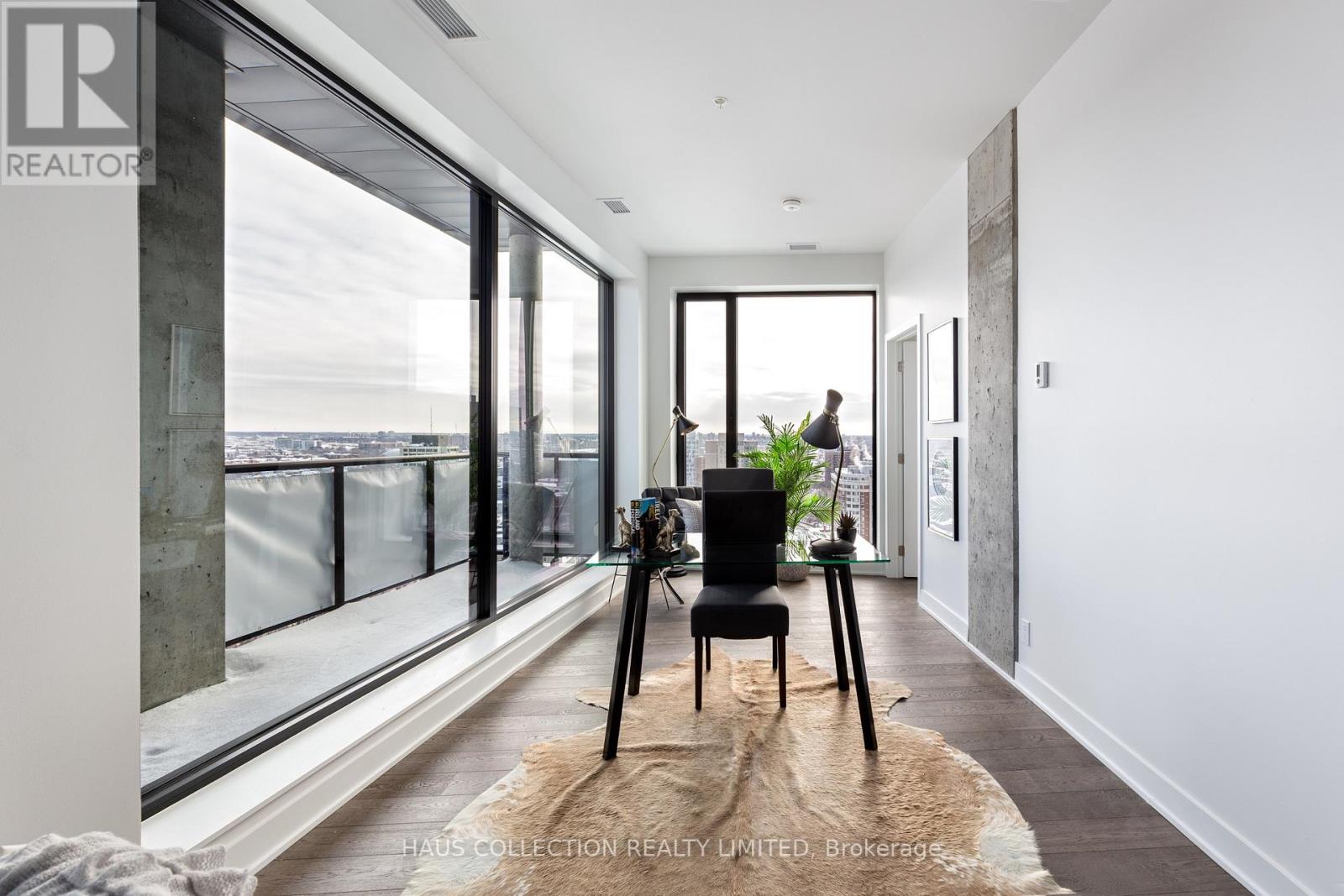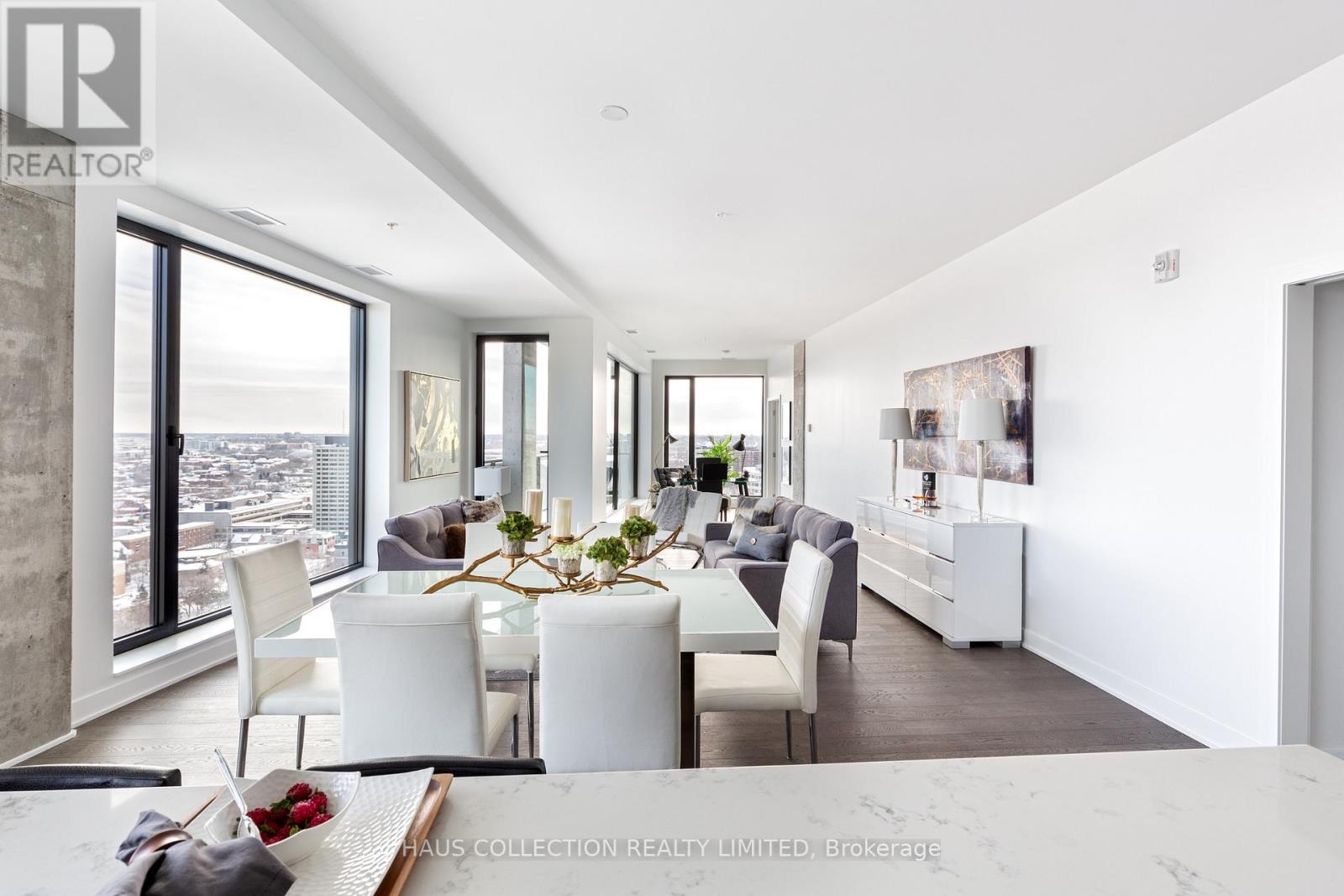 Penthouse 2305 at ArtHaus is a rare offering that elevates downtown living in every sense. This 2-bedroom, 2-bathroom corner suite boasts soaring 10-foot smooth ceilings, expansive portrait windows with sweeping views to the east and south of Ottawa, and a covered balcony for quiet outdoor moments. Inside, you'll find premium upgrades throughout: oak hardwood floors, custom window sheers, remote-controlled blackout curtains in both bedrooms, and a generous foyer with built-in storage. The kitchen is a showpiece featuring integrated JennAir appliances (including built-in fridge and wine cooler), quartz waterfall island, designer light fixtures, and exceptional storage. The open-concept layout flows seamlessly into the living and dining areas, bathed in natural light. The primary bedroom includes a walk-in closet with custom cabinetry and an elegant ensuite with rainfall shower and wand. A full-size washer/dryer and a second bathroom with tub complete this sophisticated residence. ArtHaus is an intimate, boutique residence with only 87 suites. On this exclusive penthouse floor, you're one of just four residences offering unmatched privacy in the heart of downtown. Residents enjoy a private lobby, fitness studio, rooftop terrace with fireplace and BBQs, resident lounge, and is uniquely situated atop the Ottawa Art Gallery and Le Germain Hotel, offering effortless access to downtown Ottawa's cultural and culinary amenities. A truly unique and elevated living experience awaits. Photos shown are of the unit when previously staged. (id:49063)