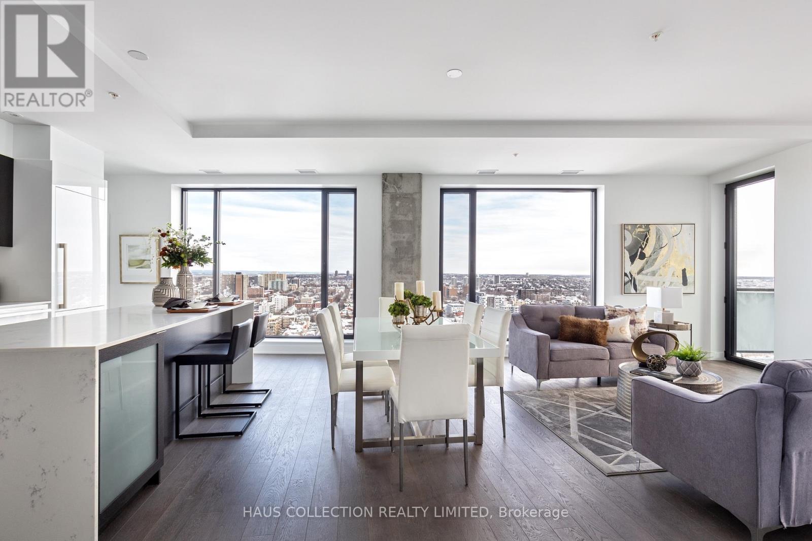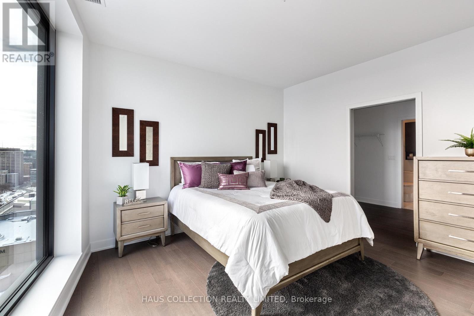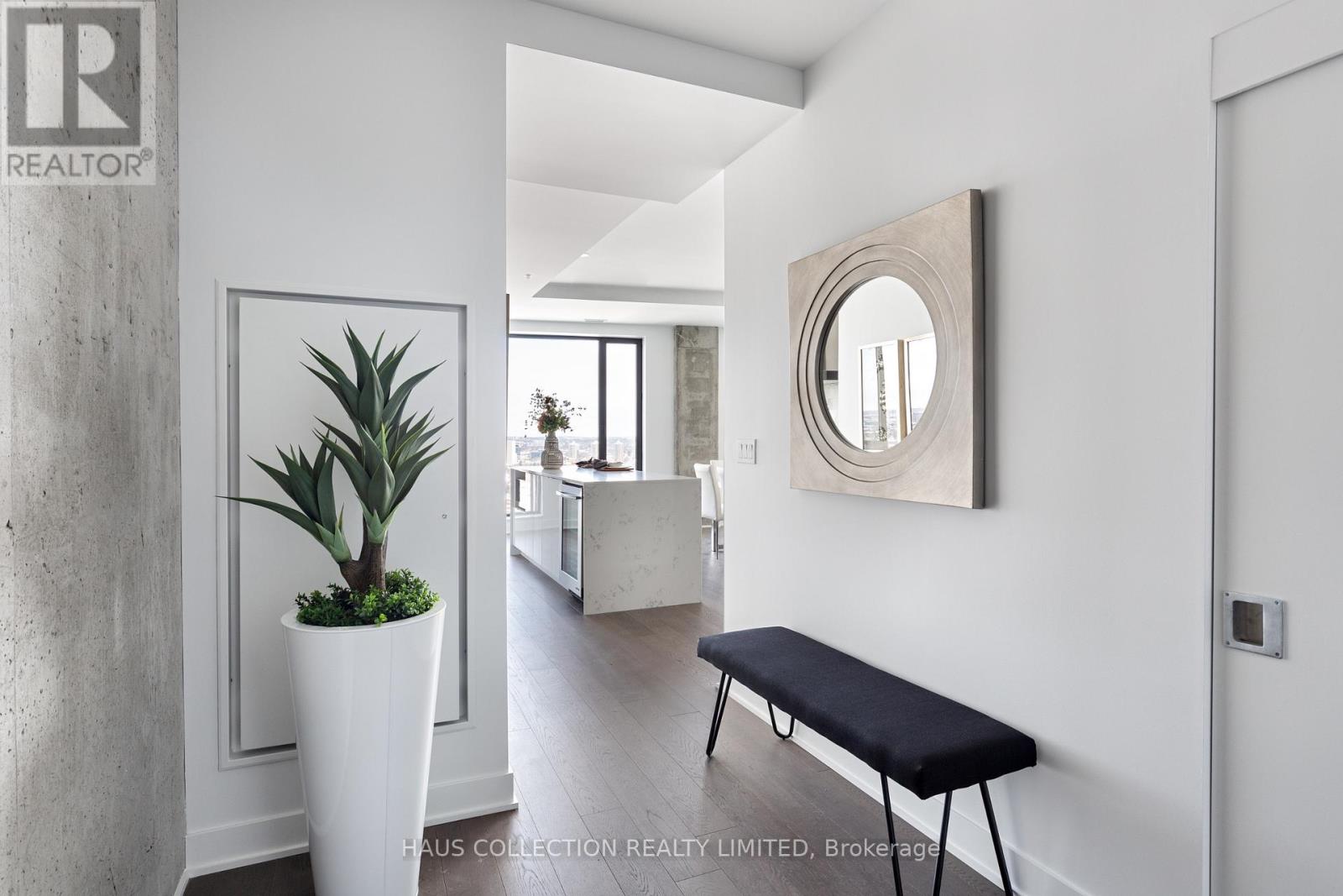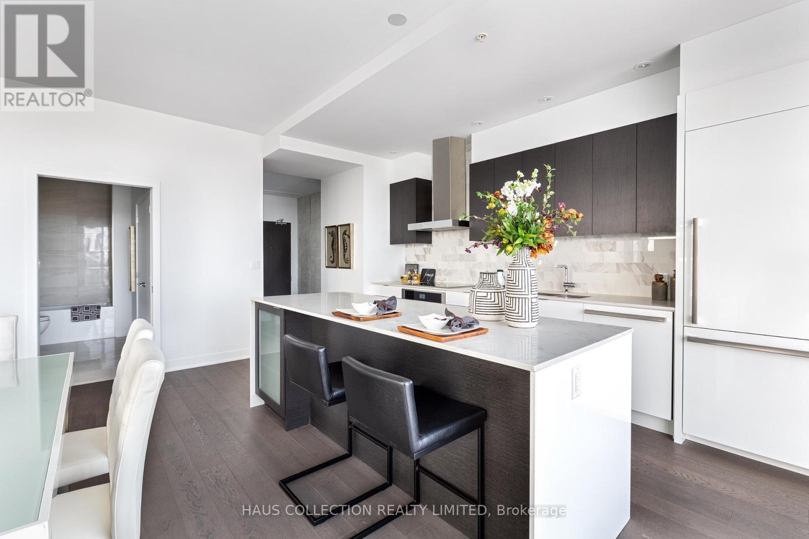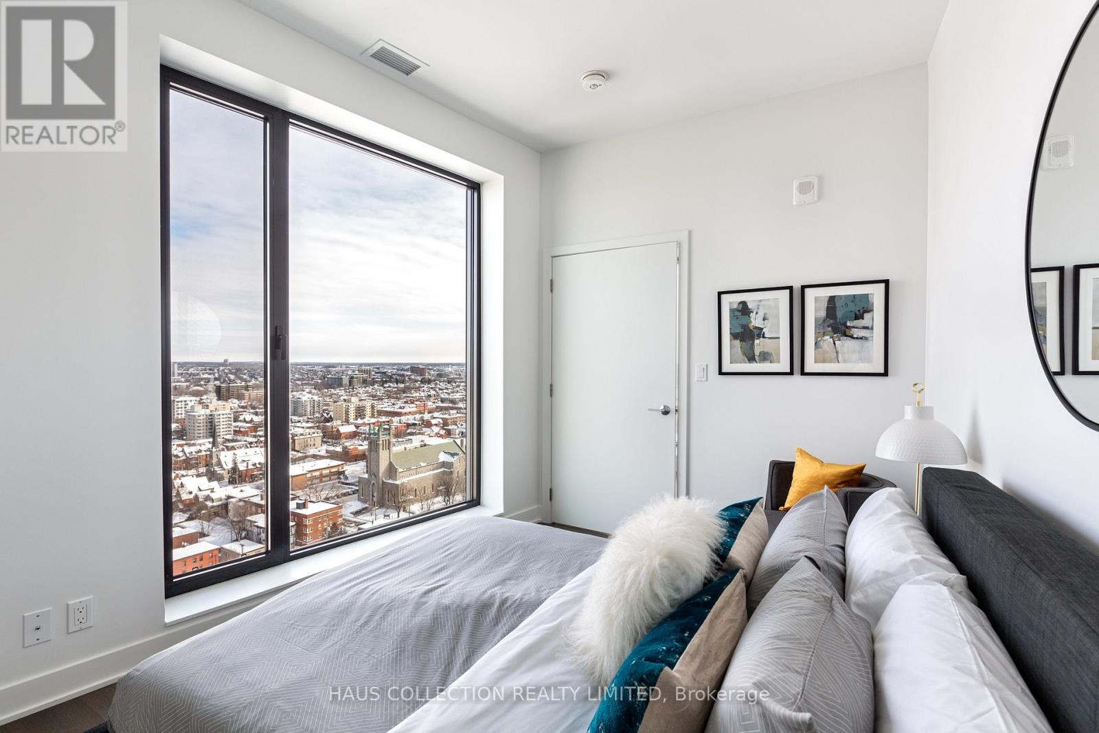 Penthouse 2305 at ArtHaus is a rare offering that elevates downtown living in every sense. This 2-bedroom, 2-bathroom corner suite boasts soaring 10-foot smooth ceilings, expansive portrait windows with sweeping views to the east and south of Ottawa, and a covered balcony for quiet outdoor moments. Inside, you'll find premium upgrades throughout: oak hardwood floors, custom window sheers, remote-controlled blackout curtains in both bedrooms, and a generous foyer with built-in storage. The kitchen is a showpiece featuring integrated JennAir appliances (including built-in fridge and wine cooler), quartz waterfall island, designer light fixtures, and exceptional storage. The open-concept layout flows seamlessly into the living and dining areas, bathed in natural light. The primary bedroom includes a walk-in closet with custom cabinetry and an elegant ensuite with rainfall shower and wand. A full-size washer/dryer and a second bathroom with tub complete this sophisticated residence. ArtHaus is an intimate, boutique residence with only 87 suites. On this exclusive penthouse floor, you're one of just four residences offering unmatched privacy in the heart of downtown. Residents enjoy a private lobby, fitness studio, rooftop terrace with fireplace and BBQs, resident lounge, and is uniquely situated atop the Ottawa Art Gallery and Le Germain Hotel, offering effortless access to downtown Ottawa's cultural and culinary amenities. A truly unique and elevated living experience awaits. Photos shown are of the unit when previously staged. (id:49063)